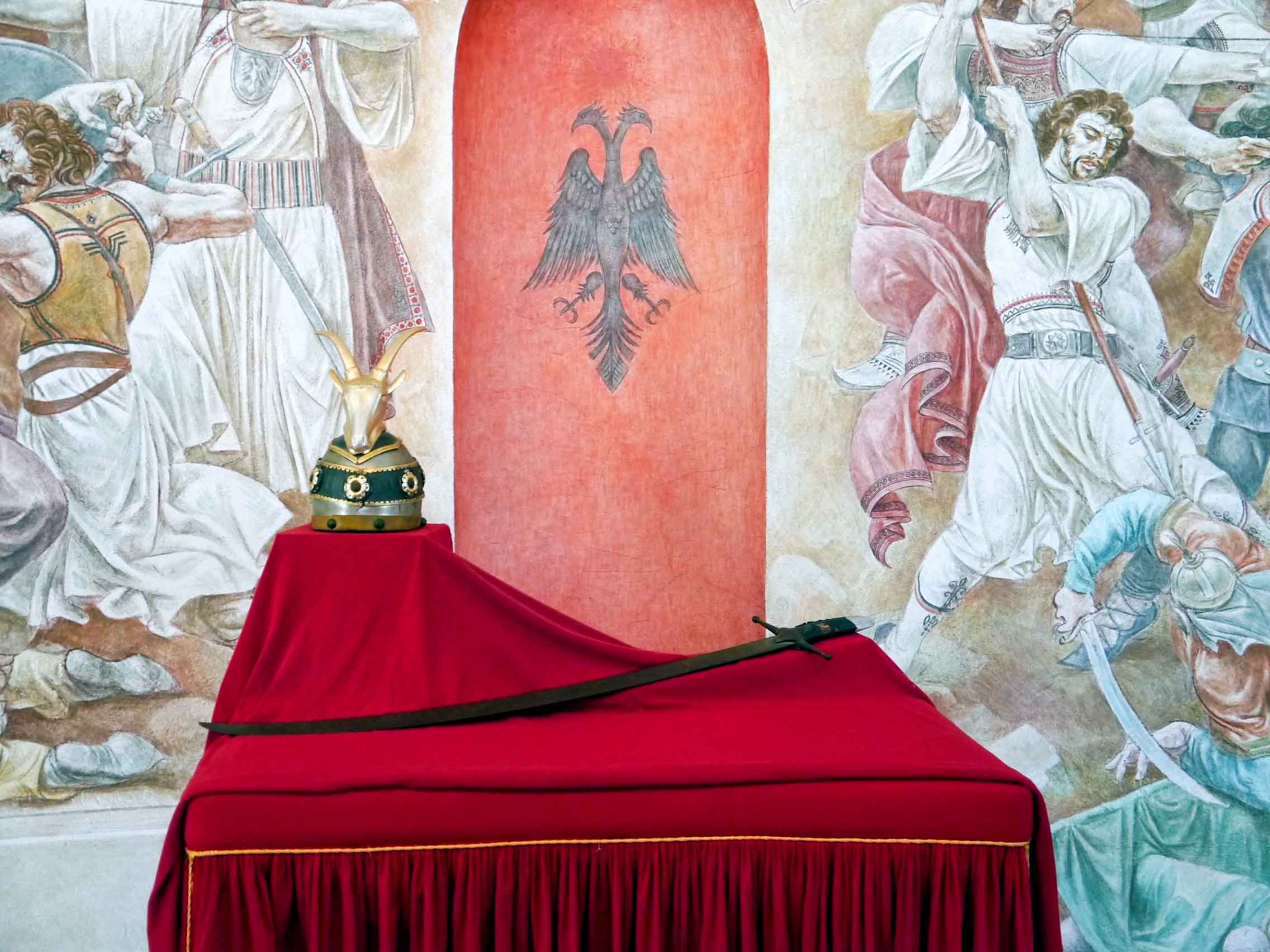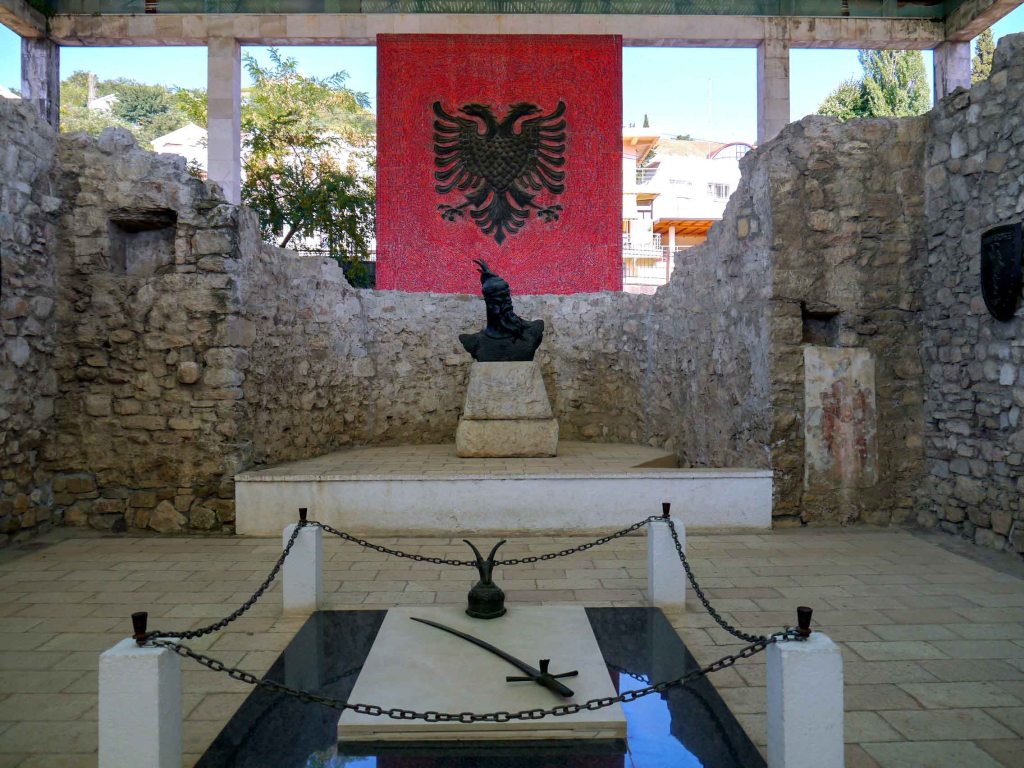 Today, there are several memorials and sites associated with Skënderbeu’s legacy in Albania. Muzeu Historik Kombëtar Gjergj Kastrioti Skënderbeu [National History Museum Gjergj Kastrioti Skënderbeu], showcasing his life, military campaigns, and cultural impact, is housed in Kalaja e Krujës [Krujë Castle], his stronghold during his fight against the Ottoman Empire. Unfortunately, only four artifacts belonging to Skënderbeu have survived to this day: his famous helmet, two swords, and a prayer book. The helmet and swords are displayed at the Collection of Arms and Armour in Vienna’s Neue Burg [New Castle], affiliated with the Kunsthistorisches Museum [Museum of Fine Arts]. While, the prayer book is archived at the Shelley Publishing House in Chelsea, London. Skënderbeu has many statues in Albania and around the world, with his equestrian statues in Krujë and Tiranë being particularly striking. His memorial tomb, the Vendvarrimi i Gjergj Kastrioti Skënderbeu [Tomb of Gjergj Kastriot Skënderbeu] can be found in Lezhë.