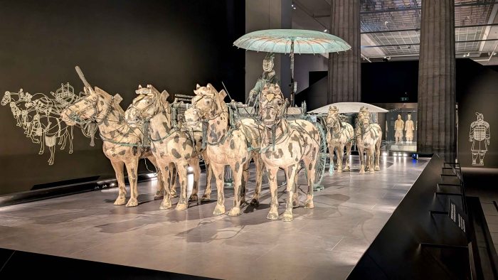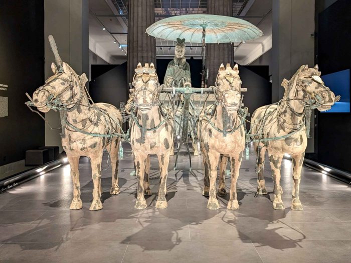 One of the most celebrated discovers is the Pit of the Imperial Chariots, located west of the burial mound. Here, archaeologists uncovered two half-scale bronze chariots from Qin Shi Huang’s ceremonial procession, complete with horses and drivers. These vehicle rank among the most valuable and technically sophisticated finds within the entire mausoleum complex, representing the pinnacle of ancient Chinese bronze-working. Over the centuries, the immense weight of the overlying earth crushed the ensemble, shattering it into thousands of fragments. As a result, archaeologists chose to remove the remains from their original location in large wooden crates that enclosed both the chariots and the surrounding mass of earth. This was followed by a painstaking process of cleaning, conservation, and reassembly – a task that took eight years to complete. Far from being merely symbolic objects, the chariots are precise technical models, complete with functioning components such as axles, suspension systems, and reins, reflecting both the ceremonial splendor of the imperial court and the advanced technological knowledge of the Qin period.