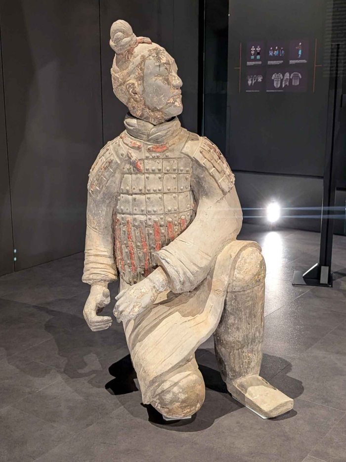 Standing between 180 and 200 centimeters tall and weighing approximately 200 kilograms, the soldiers of the Terracotta Army are strikingly lifelike. Each figure displays a distinct personality, conveyed through subtle variations in facial features, expressions, and hairstyles. Together, they represent a wide range of military formations and ranks, reflecting the highly organized structure of the Qin army. Among them are infantrymen, chariot warriors, and cavalrymen, with infantry forming by far the largest group. These infantrymen may have served either as members of large, coordinated units or as independent formations. Distinctions between individual soldiers and military units are clearly expressed through variations in armor, posture, and hairstyle. The armored infantry figures can be divided into three distinct groups based on their hairstyles. Solders in the first group wear their hair tied into a topknot positioned on the right side of the head. In the second group, the hair is tightly bound at the back of the head but not formed into a topknot. In the third group, the gathered hair is concealed beneath a small textile cap, drawn tight at the back to prevent it from shifting during movement. These subtle yet deliberate variations enhance the realism of the figures and underscore the Qin dynasty’s emphasis on military order and visual differentiation. Altogether, an estimated 8,000 terracotta figures have been discovered across the excavation pits. When unearthed, all were found shattered into numerous fragments, many bearing traces of burning. Upon examination, this evidence suggests deliberate human intervention, although the exact cause and circumstances of the destruction remain uncertain. Restoring a single figure is an exceptionally complex and time-consuming process: conservators must carefully clean, catalog, and analyze hundreds of fragments before reassembling them into a coherent whole – a painstaking task that can take up to three years to complete.