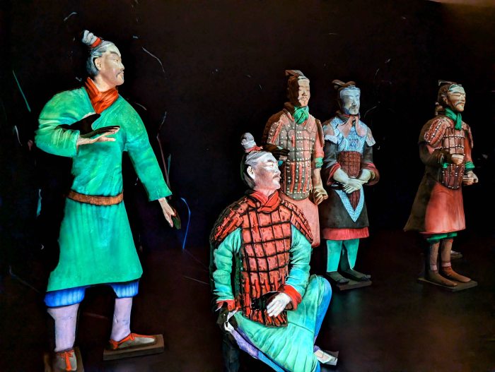 Scholars continue to debate how the thousands of soldiers of the Terracotta Army were made, reflecting the extraordinary scale and sophistication of the project. According to many Chinese researchers, each figure was crafted as a unique individual. Evidence supporting this view includes visible traces of potters’ tools on the interior surfaces of the figures, fingerprints and handprints left by craftsmen during shaping, and inscriptions bearing the names of individual artisans or workshops carved or stamped onto the statues. A different and influential interpretation was advanced by the German sinologist Lothar Ledderose, who described the creation of the Terracotta Army as an early form of mass production. In his view, the figures were manufactured using a modular system: standardized components such as arms, legs, and torsos were produced in molds, and then assembled in a variety of combinations. After assembly, surface details were refined by hand, allowing for variation within an otherwise standardized framework. This method would have enabled the Qin state to produce thousands of figures efficiently while maintaining a high degree of visual diversity. Despite their differences, both interpretations agree that the heads were made separately from the bodies, individually modeled, and fired independently before being attached. After firing, the statues were painted in vivid colors – including reds, blues, greens, and purples – to enhance their realism. Although much of this pigmentation had faded or flaked away since excavation, traces of the original paint survive and can be scientifically analyzed, allowing scholars to reconstruct the army’s original, brightly colored appearance. This highly organized system of production in which responsibility and quality control were carefully monitored, while still allowing room for individual craftsmanship, resulted in a vivid portrayal of a Qin army rather than a mass of identical statues.