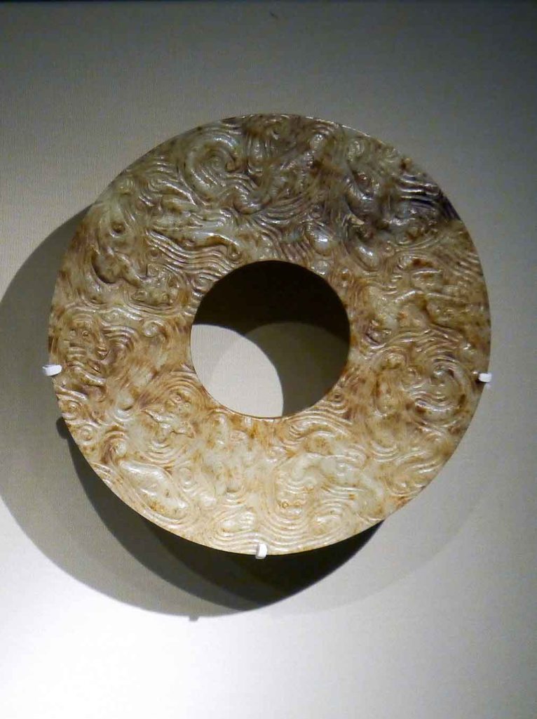 Together, these objects symbolized the harmony between Heaven and Earth, reinforcing both cosmic balance and social hierarchy during rituals. During the Han dynasty, jade burial practices became especially elaborate; the tomb of Prince Liu Sheng, for example, contained a complete jade burial suit composed of small stone plaques reflecting the belief that jade could preserve the body and protect the spirit in the afterlife. In addition to formal ritual objects, jade was widely used in personal adornment among the elite. Jade carvings depicting coiled dragons were worn as hanging ornaments on garments, signaling noble status and providing spiritual protection. The prominence of the dragon motif may have been influenced by emerging beliefs about the afterlife, which from the 4th century BC onward envisioned the celestial realm as inhabited by powerful, serpentine creatures. At the same time, the coiled dragon form appears to have drawn inspiration from the S-shaped depictions of predatory animals found on belt ornaments used by nomadic tribes along China’s frontier regions, illustrating the dynamic exchange of artistic motifs between settled Chinese societies and neighboring cultures.