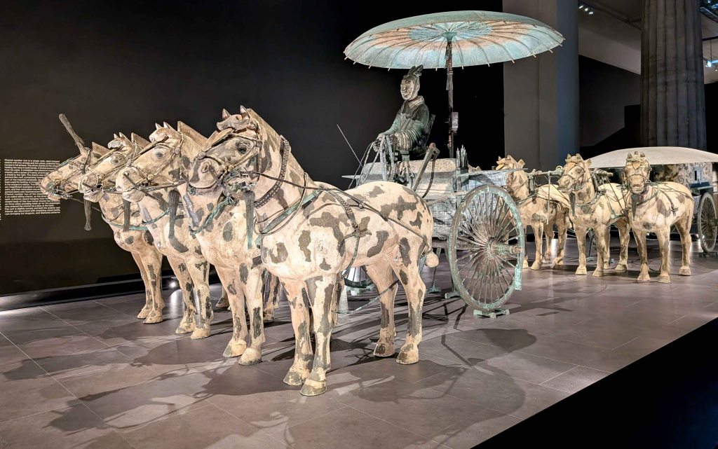In ancient China, the Six Arts formed the foundation of elite education, combining moral, intellectual, and physical training to cultivate well-rounded and capable individuals. The six disciplines were: rituals (including proper conduct, ceremonies, and moral behavior), music (appreciation, performance, and understanding), archery (emphasizing discipline, precision, and focus), calligraphy (mastery of writing, script, and literary expression), arithmetic (knowledge of numbers, calculation, and measurement), and chariot driving (including horsemanship, coordination, and battlefield strategy). Together, they provided a comprehensive education designed to prepare the elite for roles in governance, military command, and ritual leadership, embodying the Confucian ideal of cultivating both virtue and practical competence. The chariot appeared in China around 1200 BC and quickly became central to both warfare and transportation, as well as a powerful symbol of social rank and authority. Because of its military and ceremonial significance, great attention was paid to the decoration of horse tack and chariots. The rank of the passenger was indicated by the quality and richness of the harness decorations, and by the number of harness bells, which not only displayed wealth but also produced resonant sounds during processions and in battles. Among the most striking elements of chariot ornamentation were the bronze axle caps – cylindrical fittings that tapered toward the ends and were secured with intricately crafted animal-headed axle pins – combining technical functionality with symbolic artistry. During the Zhou period, chariots were so highly valued that they were often included in elite tombs, sometimes alongside their horses and drivers, reflecting the belief that the deceased would continue to require them in the afterlife.