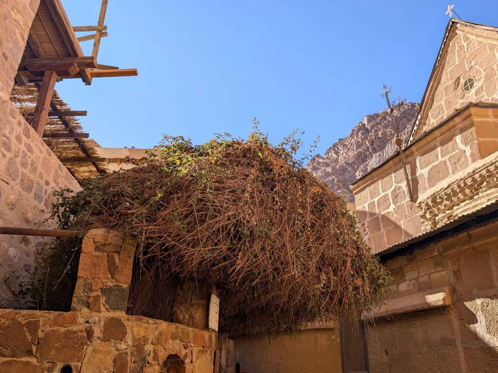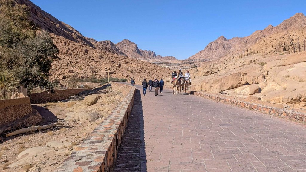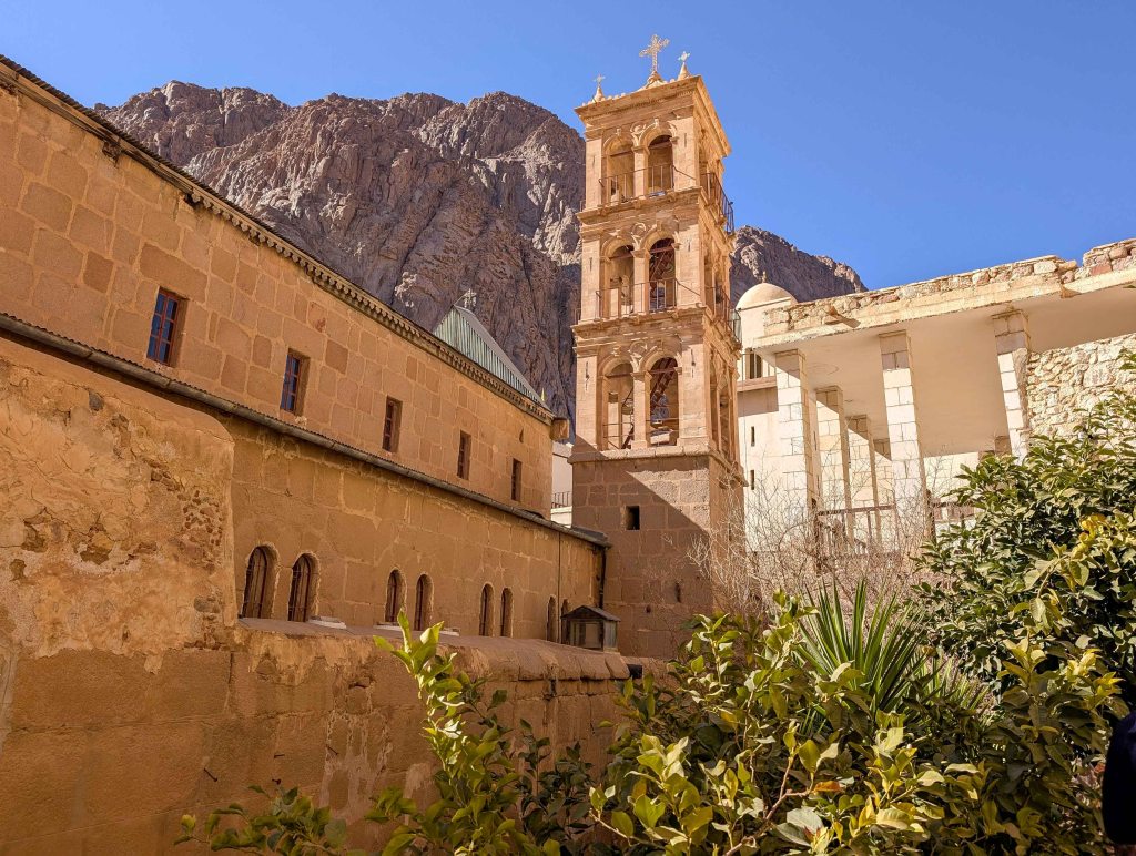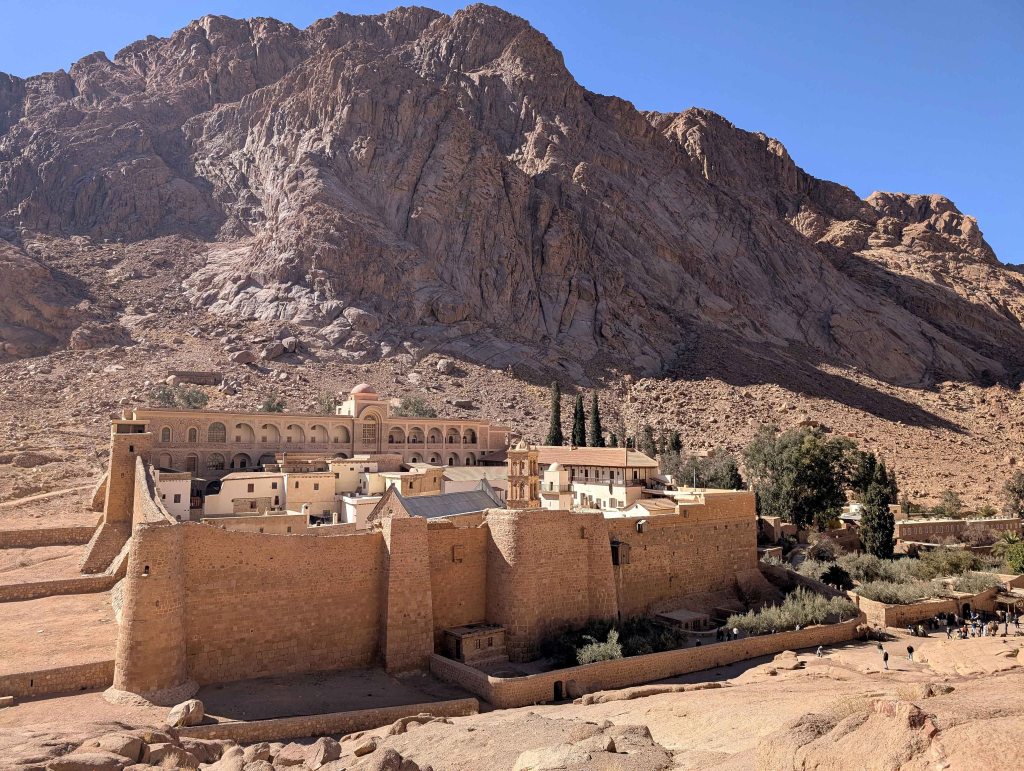 St Catherine’s Monastery is part of a growing complex that includes hotels and shops. To reach the monastery, visitors must walk from the parking lot along a paved path through a valley flanked by barren mountainsides. Inside the massive fortified walls, visitor will find a centuries-old bramble traditionally believed to be the biblical Burning Bush. The monastery also houses the Well of Moses, where Moses is said to have met his future wife, Zipporah. The well remains one of the monastery’s primary sources of water to this day. Visitors can also explore the monastery’s Byzantine church, which is steeped in history and architectural beauty. A small but exceptionally well-curated museum showcases some of the monastery’s treasures, including a selection of icons, ancient manuscripts, and a copy of the Ashtiname of Muhammad. Outside the monastery, Bedouins offer knickknacks and camel rides to visitors. For hikers, the monastery serves as the starting point for treks to nearby mountains, including Mount Sinai, which is traditionally identified as the place where God appeared to Moses and gave him the tablets bearing the Ten Commandments.