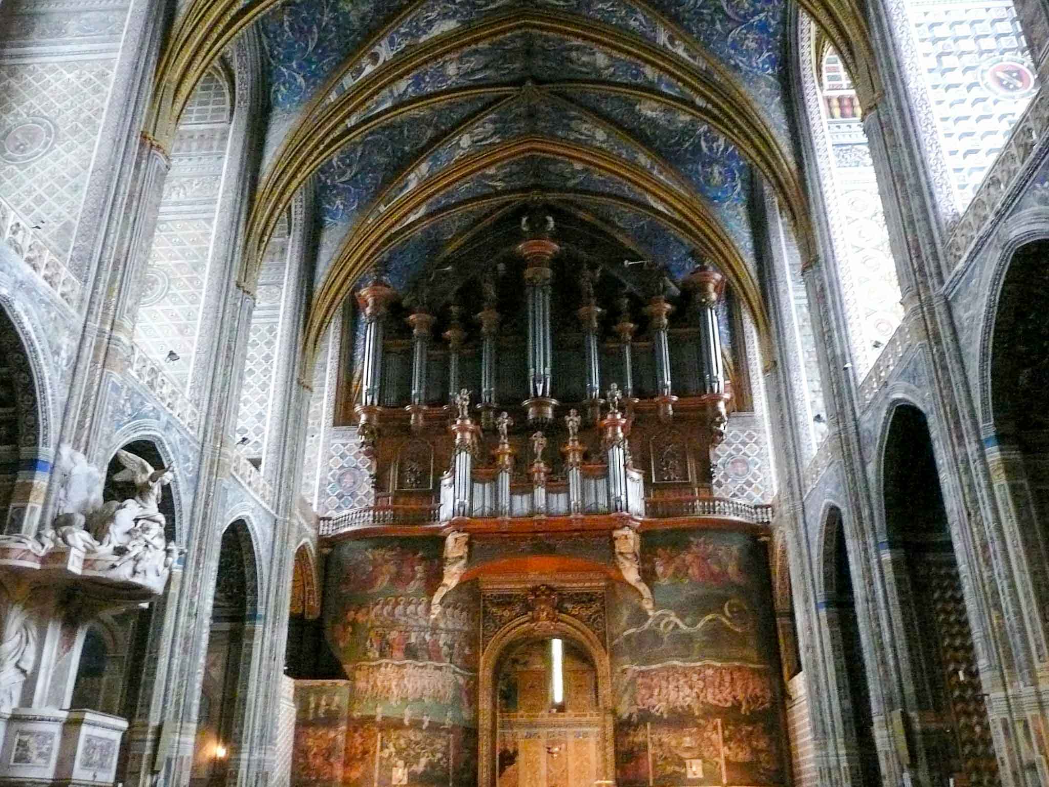 From 1282, the construction of the Cathédrale Ste-Cécile took two centuries. Eight centuries later, it is still one of the largest brick buildings in the world. The austere and formidable exterior of the building hides sumptuous interior decorations, such as the rood screen. This 15th-century ornamental screen is a filigree masonry made in the Flamboyant Gothic style and decorated with polychrome sculptures.