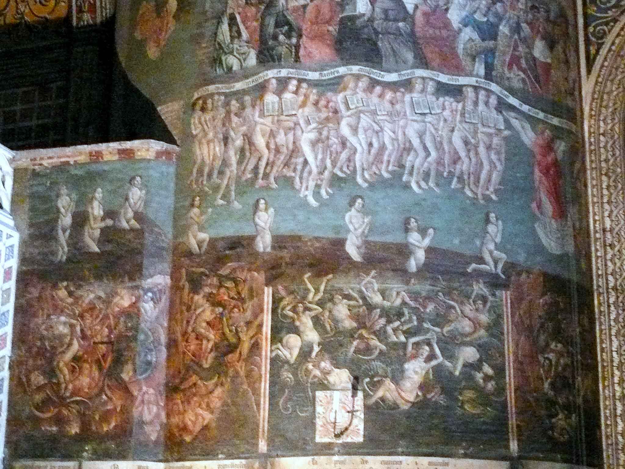The cathedral’s most significant masterpiece is the Jugement Dernier [Last Judgement], a massive apocalyptic fresco painted at the end of the 15th century. Unfortunately, the construction of a new chapel behind the fresco in 1693 led to the destruction of its central part, including the figure of Christ rendering judgement. The upper section of the painting features angels, followed by apostles dressed in white, and various saints, clerics and monks. In the middle of the fresco, sinners are being judged, and the book hanging around their necks contains their good and bad deeds. At the bottom, the fresco portrays hell, organized into seven sections that correspond to the seven deadly sins.