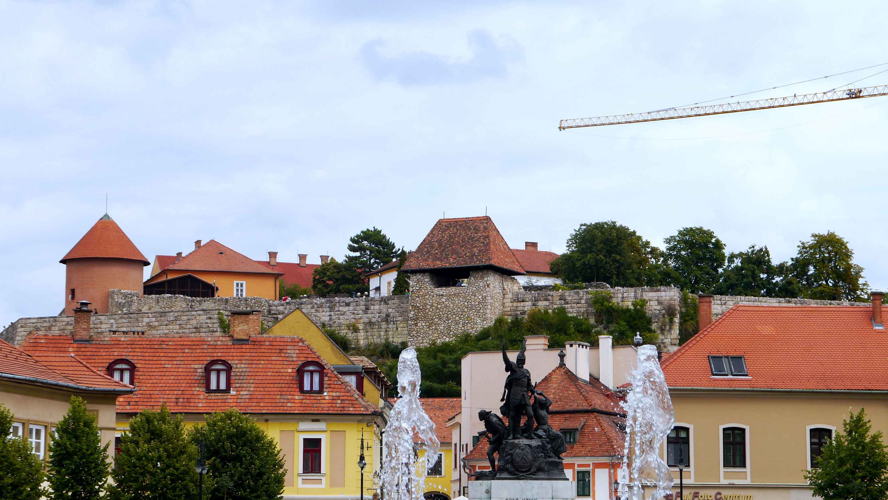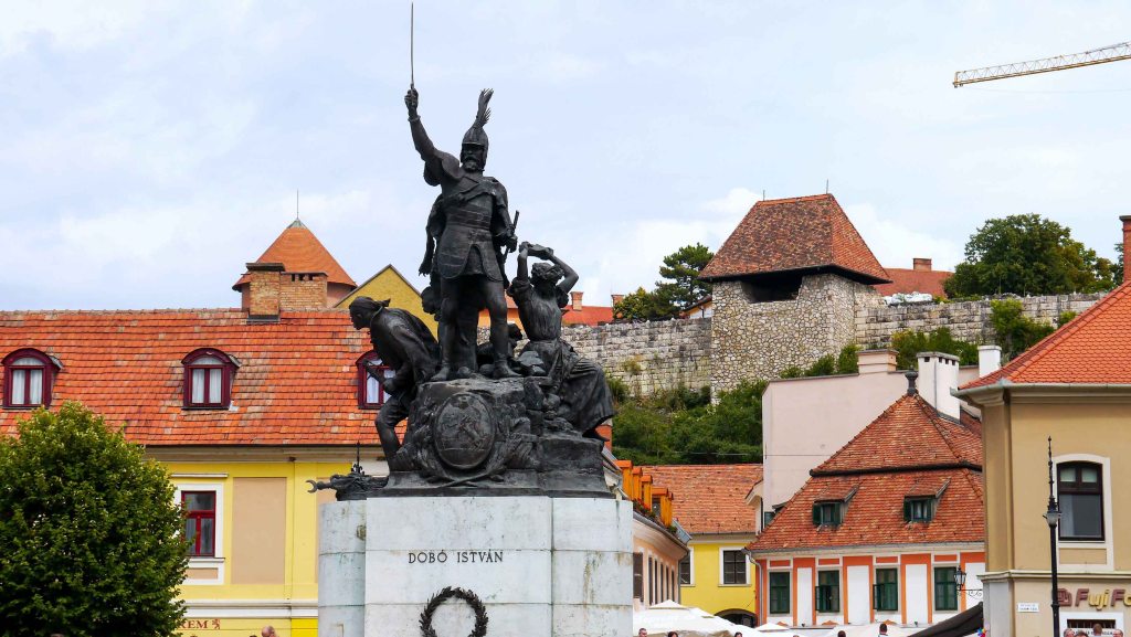 The heart of the city is Dobó-tér [Dobó Square], a popular meeting place for locals and tourists. This square, dominated by the Egri vár in the background, is lined with restaurants and cafés. The focus point of the square is an impressive monument of István Dobó, a hero of the Siege of Eger. The monument, created by sculptor Alajos Stróbl in 1907, depict Dobó wielding his sword, flanked by a a warrior on his right and a woman throwing a stone on his left. While exploring the winding lanes and hidden courtyards of the old town, visitors can admire the Baroque architecture of Eger. One of the most notable examples is the Megyeháza [County Hall], which features some of the most beautiful wrought-iron gates in Hungary, known as the Fazola-kapuk [Fazola Gates]. These gates were created by Henrik Fazola in 1761, along with many other wrought iron works in the city.