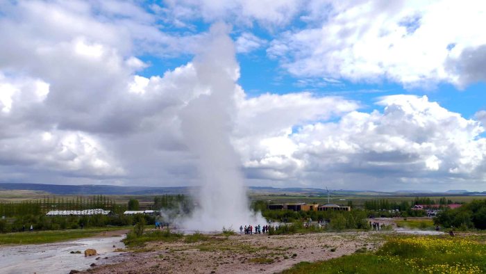 The Haukadalur geothermal area is renowned for its geysers, namely Geysir and Strokkur. Deep underground, magma heats the meltwater from the Langjökull Glacier, causing it to surge to the surface through vents. Geysir, the largest geyser in the area, provided the term ‘geyser’ to the world. However, it currently lies dormant, with eruptions occurring only after several years. When active, it can propel water up to 70 meters into the sky. While Strokkur is the most active geyser in the area, spouting scalding water up to 30 meters high every five to ten minutes. A massive bubble formation serves as a precursor, signaling an imminent eruption.