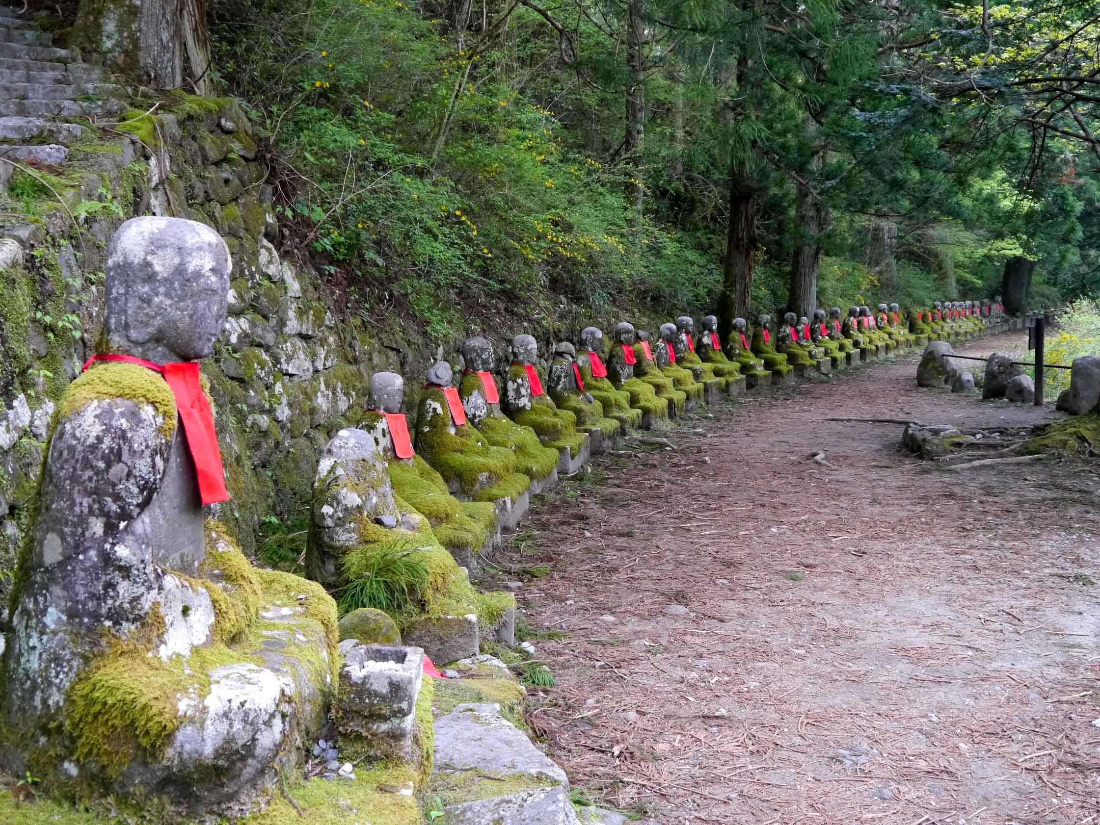 Within the forested region of the abyss, a series of stone Jizō statues grace the area. This collection of statues, known as ‘Narabi Jizō‘ [Jizō in a line], consists of approximately 70 stone figures arranged in front of a wall spanning about 100 meters, positioned overlooking the Daiyagawa River. These statues are also referred to as ‘Bake Jizō’ [Ghost Jizō] due to the curious phenomenon where each count results in a different number, adding an air of mystique to the site.