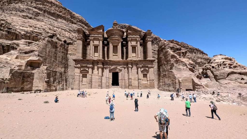 Tucked high in the mountains overlooking Petra, Ad-Deir stands as one of the most awe-inspiring and iconic monuments of the ancient Nabataean civilization. This colossal rock-carved structure showcases the Nabataeans’ exceptional adaptability in construction techniques and mastery in craftsmanship. Grander in scale but less ornamented than its more famous counterpart, Al-Khazneh, Ad-Deir commands both reverence and curiosity. Its remote location – accessible only via a strenuous uphill climb – adds to its mystique, rewarding those who undertake the journey with a profound sense of discovery.