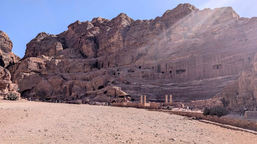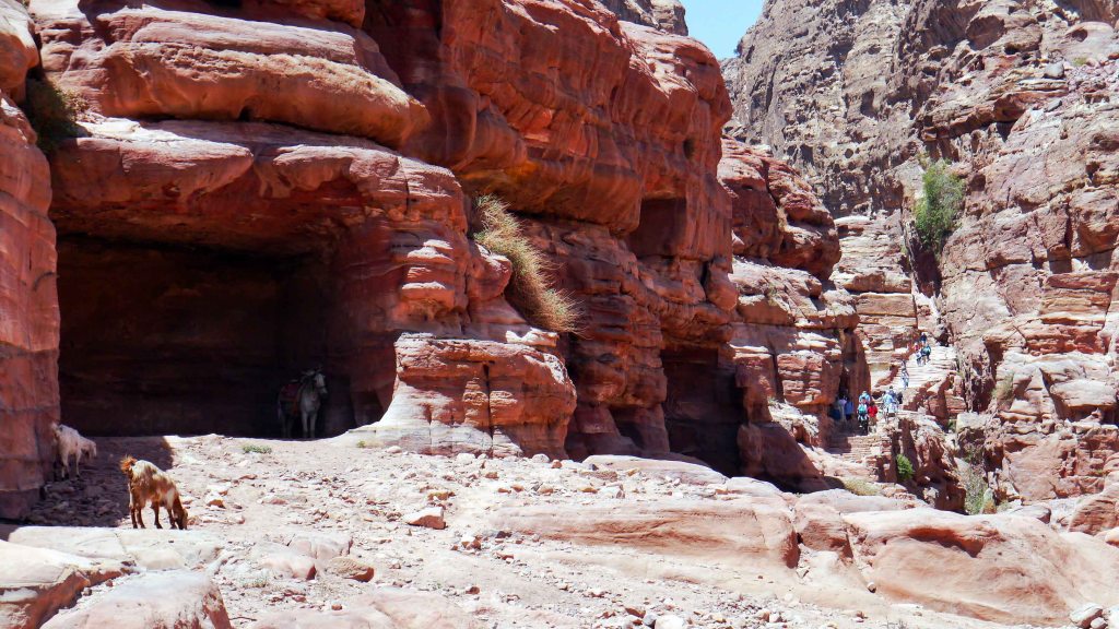 As the valley widens, the elegant Renaissance Tomb comes into view, easily recognized by the trio of urns that crown its arched entrance. Nearby stands the Broken Pediment Tomb, named for the distinctive interruption in its triangular pediment – an architectural oddity that sets it apart from Petra’s other rock-cut façades. Beyond this point, Wadi al-Farasa opens even further. The trail passes the evocative Skull Cave, a small cavity in the cliff face, before descending gently to rejoin Petra’s main trail near Qasr el-Bint.