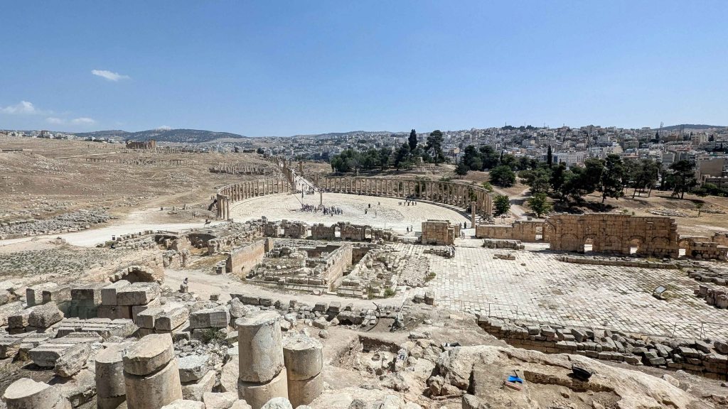 Today, Jerash offers visitors a remarkable journey through time. Entry to the site is through the Arch of Hadrian, built in honor of the emperor’s visit. Nearby stands the Hippodrome, where chariot races and athletic contests once thrilled cheering crowds. Beyond lies the South Gate, part of the 4th-century city walls, leading into the heart of ancient Gerasa. To the left rise the Temple of Zeus – dedicated to the chief deity of the Greek pantheon – and the grand South Theatre, which once seated more than 3,000 spectators and is still occasionally used for performances today. One of Jerash’s most distinctive landmarks is the Oval Plaza (1st century AD), an architectural rarity unique in the ancient world. Measuring roughly 80 by 90 meters, this asymmetrical open space is encircled by 160 Ionic columns and paved with limestone blocks laid over a sophisticated drainage system. From here stretches the Cardo Maximus, the city’s main north-south thoroughfare – a 600-meter-long colonnaded street lined with public buildings, shops, and residences. Deep grooves in the paving stones mark the ruts left by ancient chariots. To the west lies the Agora, once the bustling food market of Gerasa, complete with a central fountain. At the Tetrapylon, the Cardo intersects with the South Decumanus, an east-west street that connected other key parts of the city. Further north stands the Nymphaeum, a richly ornamented 2nd-century public fountain dedicated to the water nymphs, featuring a carved basin with a charming design of four fish kissing. Continuing along the Cardo brings visitors to the remains of an Umayyad Mosque, followed by the smaller but well-preserved North Theatre. Nearby stands the impressive Temple of Artemis, dedicated to the goddess of the hunt, wilderness, and fertility – the patron deity of Gerasa. The temple’s Corinthian columns still tower dramatically over the site, and visitors can experience a curious phenomenon: when gently pushed, the columns appear to sway ever so slightly, a testament to the ancient engineers’ precision. Close to the Temple of Artemis lie several Byzantine churches, including the renowned Complex of the Three Churches (526–533 AD), distinguished by beautifully preserved mosaic floors depicting vines, animals, and Christian symbols.