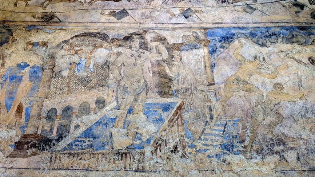 Although referred to as “castles” because of their imposing appearance and fortified walls, these structures served a variety of purposes beyond mere defense. Some functioned as residences or rest houses for travelers and traders journeying along the caravan routes connecting Egypt with Mesopotamia, while others operated as administrative centers, hunting lodges, or agricultural estates. They also fulfilled symbolic and political roles, asserting Umayyad authority over the sparsely populated desert regions and strengthening ties with local Bedouin tribes. Architecturally, a typical desert castle was designed as a self-contained compound, consisting of a main residential complex surrounded by auxiliary structures such as water reservoirs, storage rooms, stables, olive presses and grinding mills, hammams [bathhouses], and sometimes a mosque, all enclosed within protective walls. Many castles were constructed near a wadi or seasonal watercourse, ensuring access to water in the arid landscape. These desert castles reflect a charming blend of Islamic, Byzantine, and Persian architectural influences, revealing the multicultural nature of the Umayyad Caliphate. Many were richly decorated with frescoes, mosaics, and stucco reliefs that portrayed both secular and symbolic themes. The artistic detail found in these buildings demonstrates a refined aesthetic that challenges the misconception of early Islamic art as purely aniconic. Standing in solitude amid the vast desert, the qasrs evoke an aura of mystery, power, and refinement – embodying the Umayyads’ vision of dominion, sophistication, and harmony between nature and culture.
