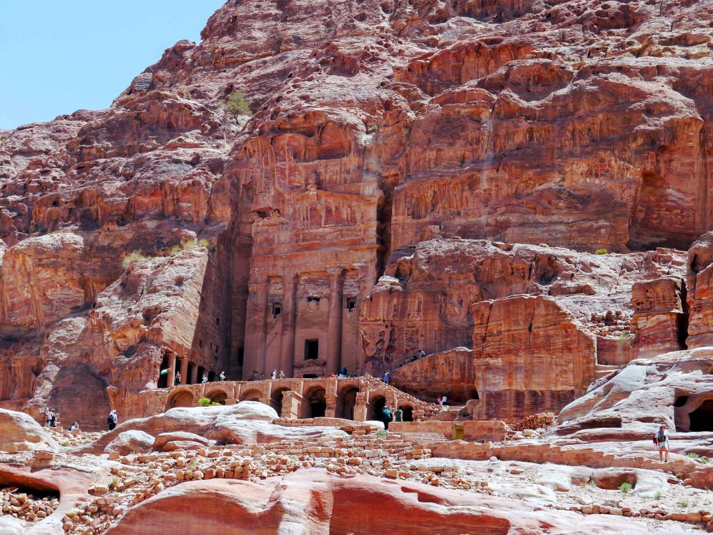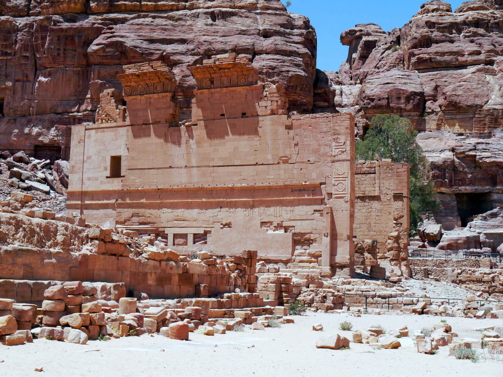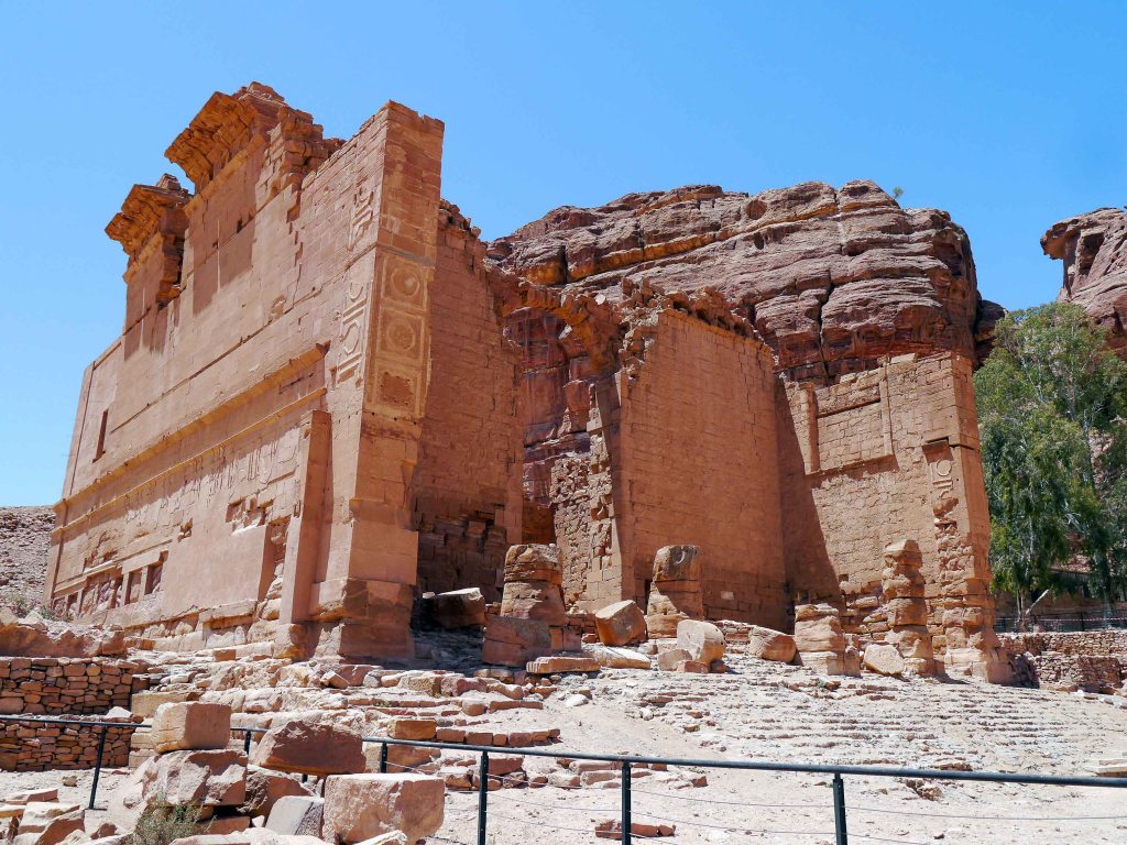 Beyond the ruins of the Great Temple and through the imposing triple-arched Temenos Gate lies Petra’s most sacred surviving monument: Qasr el-Bint [Palace of the Pharaoh’s Daughter]. Despite its name, this massive structure is not a palace but a temple – possibly dedicated to Dhu-Shara, the chief deity of the Nabataean pantheon. While Petra’s strategic location offered numerous advantages, its position at the junction of the Arabian Plate and the Sinai Subplate made the region highly prone to seismic activity. Throughout its history, Petra endured several powerful earthquakes, many of which caused the collapse of its freestanding structures. Remarkably, Qasr el-Bint is the only major freestanding Nabataean building in Petra to have survived. The temple’s square layout and the seismic-dampening wooden beams integrated into the stone masonry helped mitigate earthquake damage, making it one of the earliest known examples of earthquake-resistant architecture. Although much of its decoration has been lost to time and seismic damage, traces of stucco and marble veneer offer a faint but evocative glimpse into its former splendor. Just beyond Qasr el-Bint, a path crosses the Wadi Musa and begins an arduous yet deeply rewarding ascent along the Ad-Deir hiking trail.
