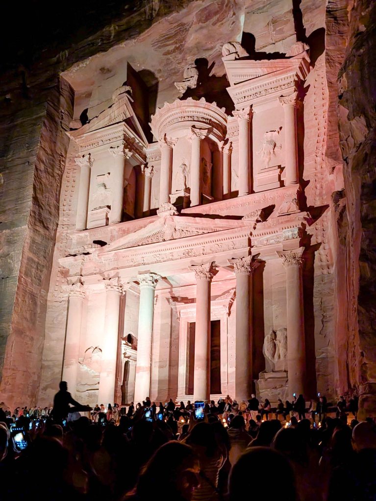 Al-Khazneh Trail is a short but rewarding climb to a dramatic overlook above Al-Khazneh, offering a breathtaking and unusual perspective of the monument below. From this lofty perch, the full majesty of the façade is revealed – framed by rugged cliffs and bathed in golden light – an awe-inspiring reminder of Petra’s fusion of natural wonder and human ingenuity. Not to be missed is Petra by Night – an evocative and atmospheric way to experience the ancient Nabataean capital. Held on select evenings, the event begins after sunset – once the site has emptied of daytime visitors – as a candlelit path guides participants through the shadowed Siq, echoing the footsteps of ancient caravans that once passed through this narrow gorge. The journey culminates at the foot of Al-Khazneh, where hundreds of lanterns illuminate the Treasury’s intricate façade in a warm, flickering glow. Accompanied by traditional Bedouin music and storytelling, the evening offers a haunting glimpse into Petra’s past – a rare opportunity to witness the rose-red city beneath the quiet stillness of the desert night, just as it might have appeared centuries ago.