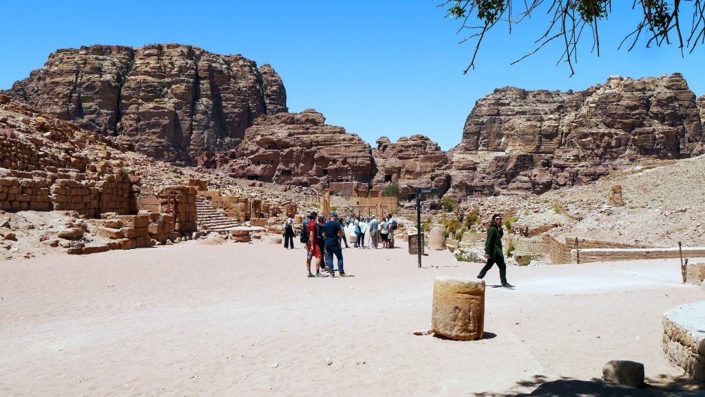 From Al-Khazneh, the path continues into the Outer Siq, also known as the Street of Façades – a dramatic corridor flanked by dozens of monumental tombs carved directly into the sandstone cliffs. These tombs, which vary widely in size and decoration, are arranged across up to four vertical tiers and reflect a broad spectrum of artistic influences and historical periods. Many are partially buried beneath centuries of accumulated sediment, their lower sections obscured by time while their upper façades remain exposed to the elements. Some scholars believe these tightly packed structures represent some of the earliest examples of monumental Nabataean architecture, offering valuable insights into the evolution of Petra’s building traditions. Near the end of the Street of Façades, a rock cut stairway – flanked by several enigmatic djinn blocks – marks the start of the High Place of Sacrifice hiking trail. The grandeur of this necropolis culminates at the far end of the Outer Siq with the classical Theatre. Carved into the mountainside by the Nabataeans in the early 1st century AD, the Theatre is a striking testament to their engineering prowess and openness to foreign cultural influences. Although later modified by the Romans, its original design predates Petra’s annexation and illustrates the Nabataeans’ integration of Greco-Roman urban features while retaining their distinct identity. With seating for up to 7,000 spectators, the Theatre would have hosted public gatherings, ceremonies, and performances – reinforcing Petra’s role not only as a commercial center, but also as a vibrant civic hub of the ancient world.