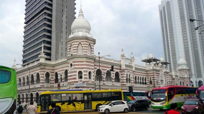 Another Mughal-style building found in the square is the National Textiles Museum [Muzium Tekstil]. Initially constructed for the railway works department, the museum provides great insight into the wealth of indigenous textile traditions. The museum’s extensive collection is organized into four themed galleries. The Tree of Life [Pohon Budi] collection covers the history of textile making, with a particular emphasis on Malaysia’s prominent textiles like batik, ikat (cloth made from threads colored with tie-and-dye technique), and songket (a silk sarong adorned with golden thread). The Rainbow [Pelangi] gallery highlights the wealth of textile treasures crafted by different ethnic groups, while the Interlocking Bays [Teluk Berantai] collection focuses on Malaysian fabrics and design motifs. Surprisingly, the Precious Essence [Ratna Sari] gallery features jewelry from various ethnic groups.