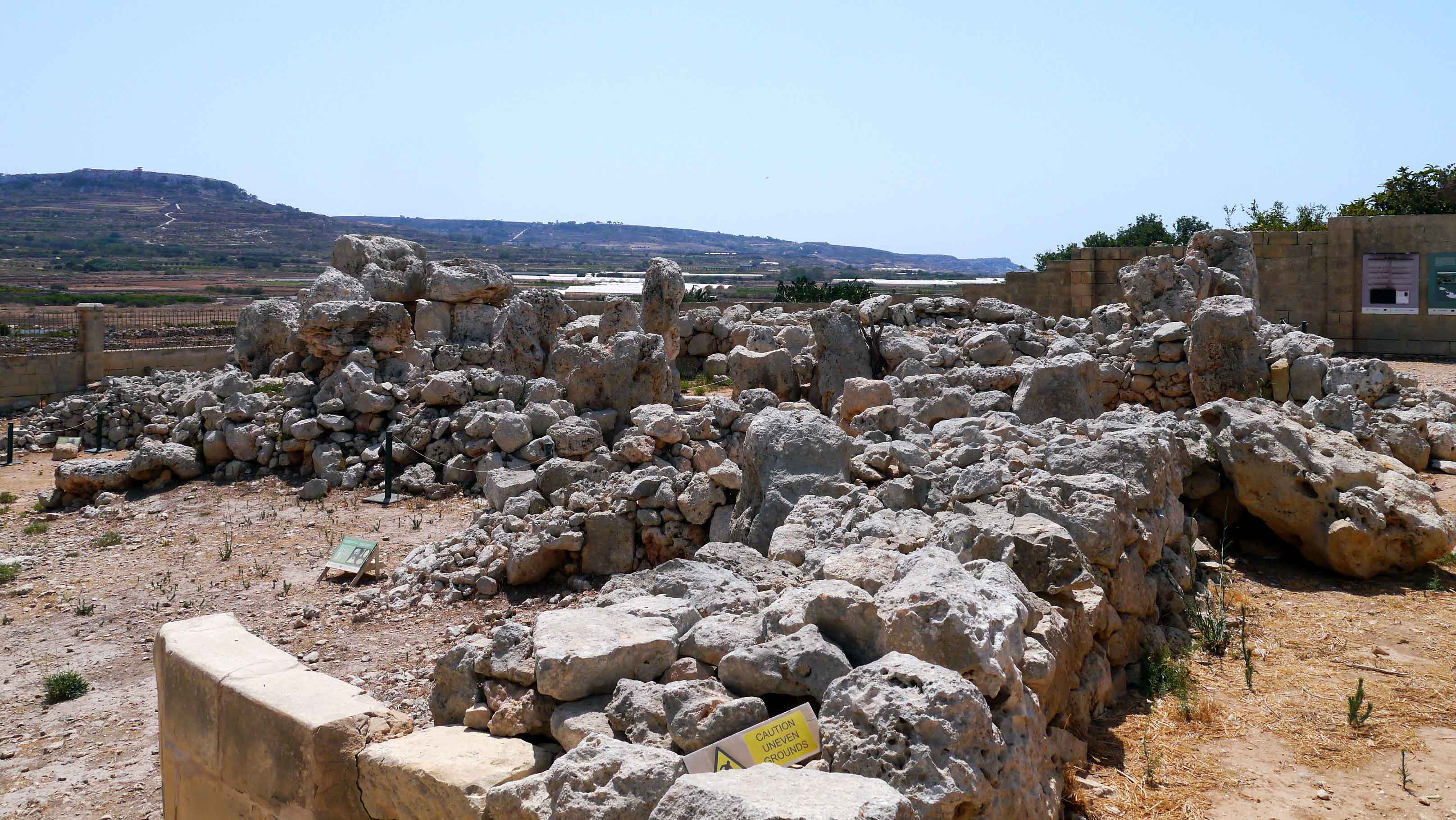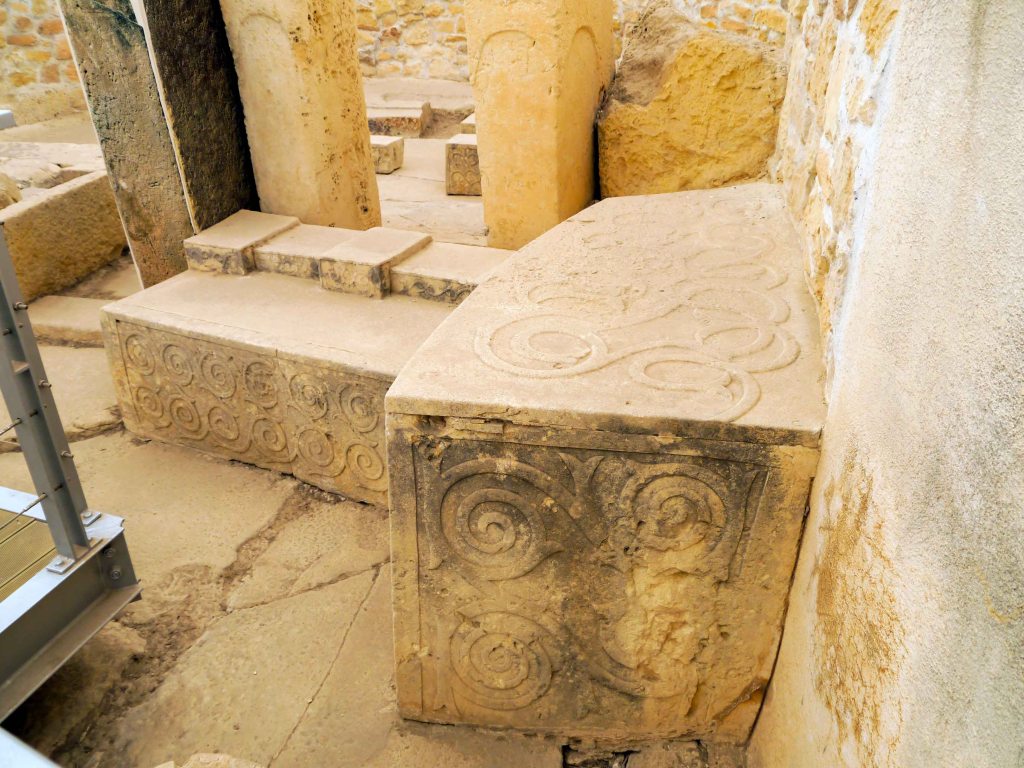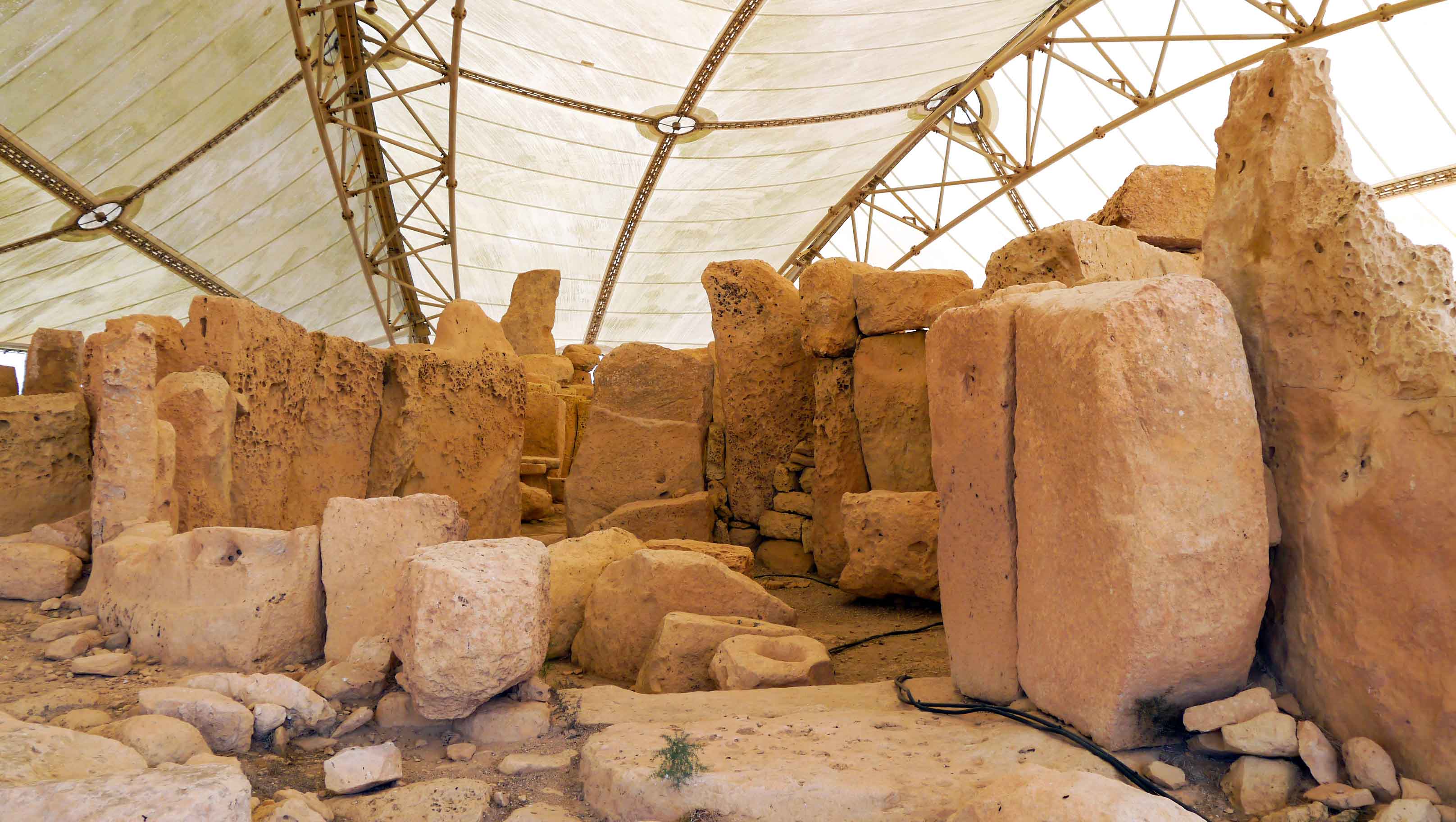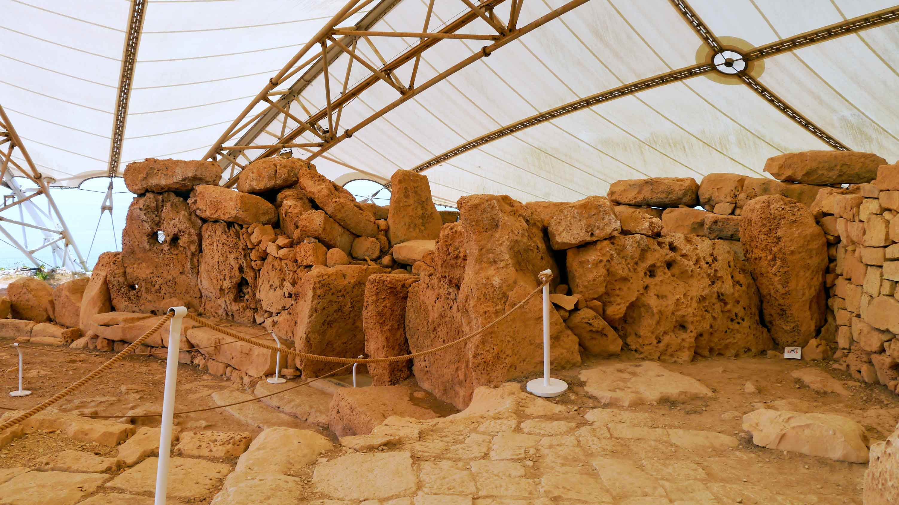 Ħaġar Qim and Mnajdra Temples are perched on a clifftop, offering a stunning view of the sea. To shield these ancient sites from the elements, permanent tent-like canopies have been installed. At Ħaġar Qim, extensive restoration work has been meticulously carried out, including the reconstruction of the façade of the main building with its trilithon entrance. This allows visitors a glimpse into its original appearance. Setting it apart from other Maltese temples, Ħaġar Qim features interconnected oval chambers arranged in a less uniform manner. Located a 500-meter walk downhill from Ħaġar Qim, Mnajdra follows a more typical layout. It consists of three adjacent buildings, each with a different orientation. What makes this site particularly intriguing is that the southern building is astronomically aligned. During the spring (20 March) and autumn (23 September) equinoxes, the rays of the rising sun pass through the main doorway, illuminating two decorated slabs in the main chamber. However, during the winter (21 December) solstice, sunlight highlights the right megalith flanking this doorway, while during the summer (21 June) solstice, it illuminates the left.