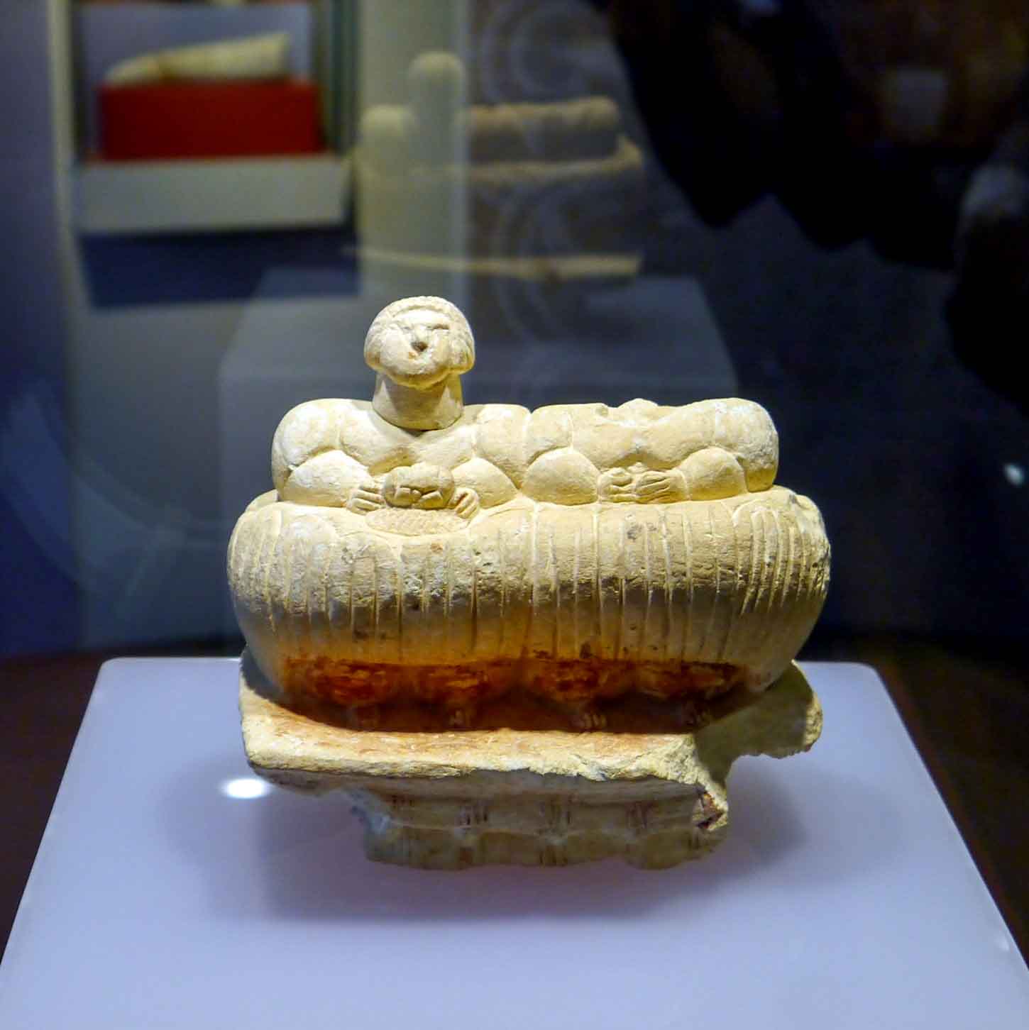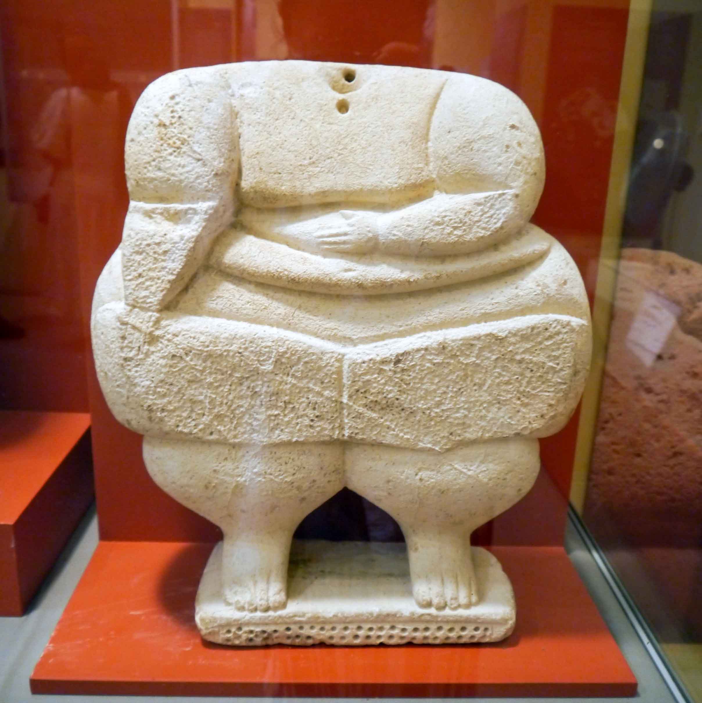One prevalent type of statue found in the temples and tombs is known as the ‘Fat Ladies’. They have massive, rounded thighs and arms, while their hands and feet are noticeably small, almost doll-like. These figures are depicted in various poses: standing, seated on thrones, or squatting with their legs tucked to one side. Among them is a particularly charming figure referred to as the ‘Sleeping Beauty’, shown lying on her side with one hand under her head. These figures are typically adorned with pleated skirts and often lack heads. However, in some instances, there is a carved hole in place of the head, suggesting that it was likely interchangeable. These sculptures are commonly interpreted as fertility figures due to their plumpness.