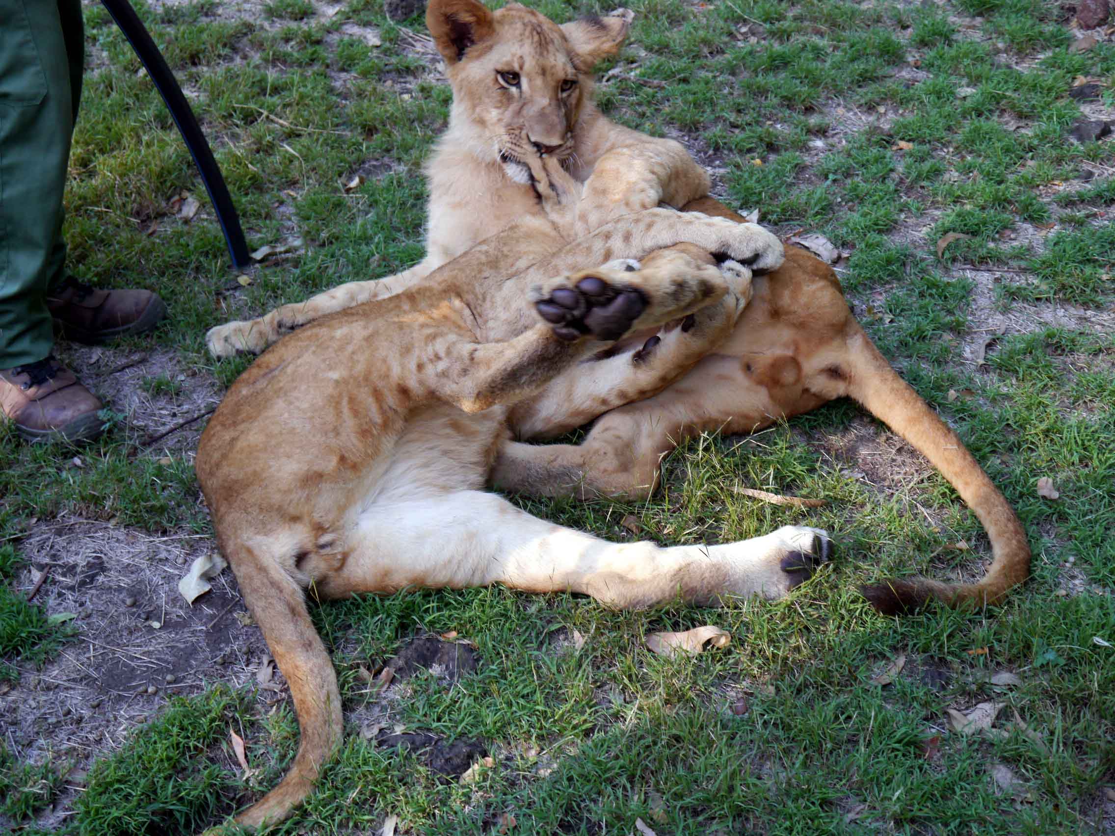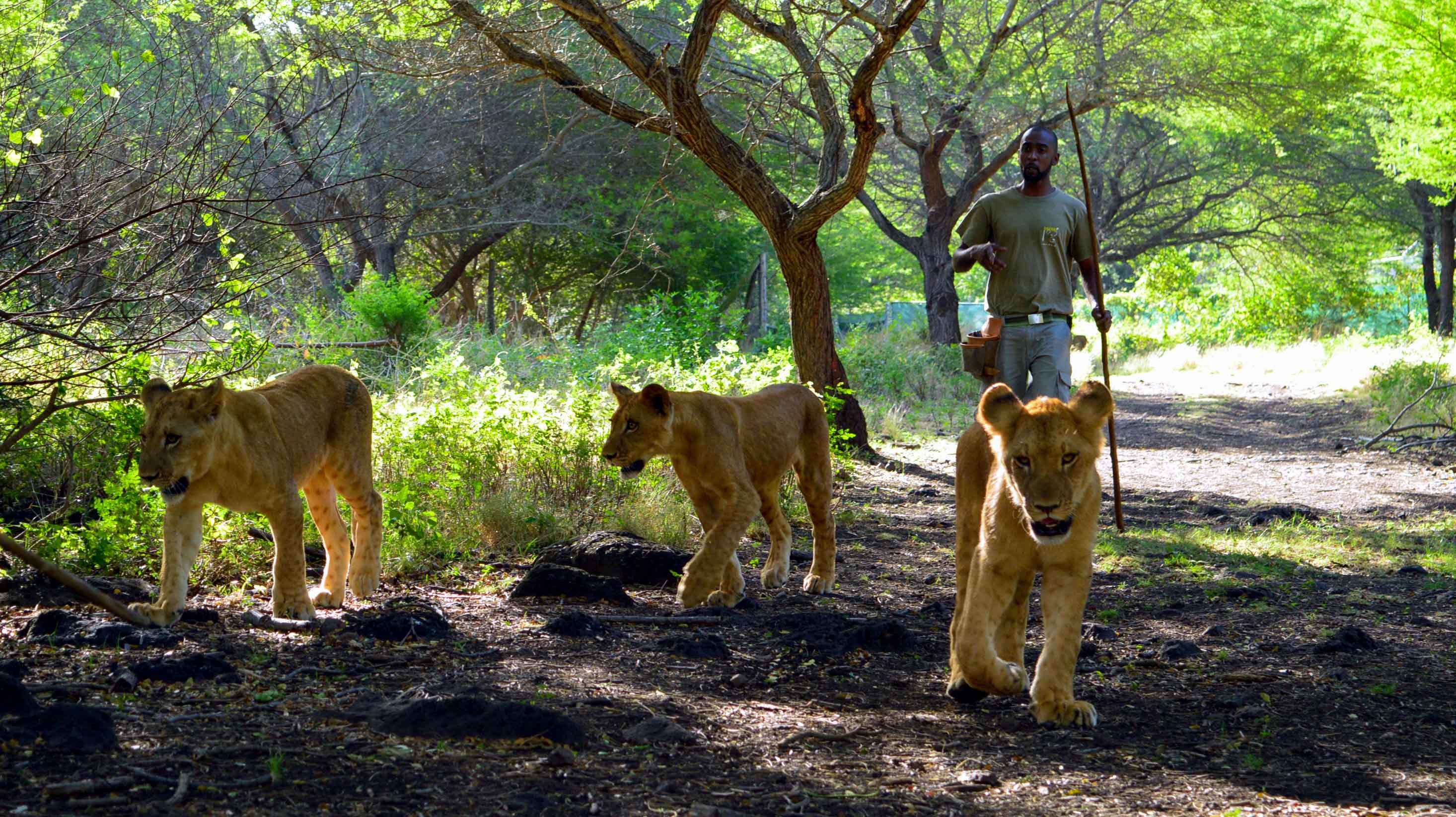 The sticks held by the rangers and visitors that appear in some of the photos do not serve as punishing devices. Instead, they are aids to help individuals maintain their balance if a lion were to jump on them.
