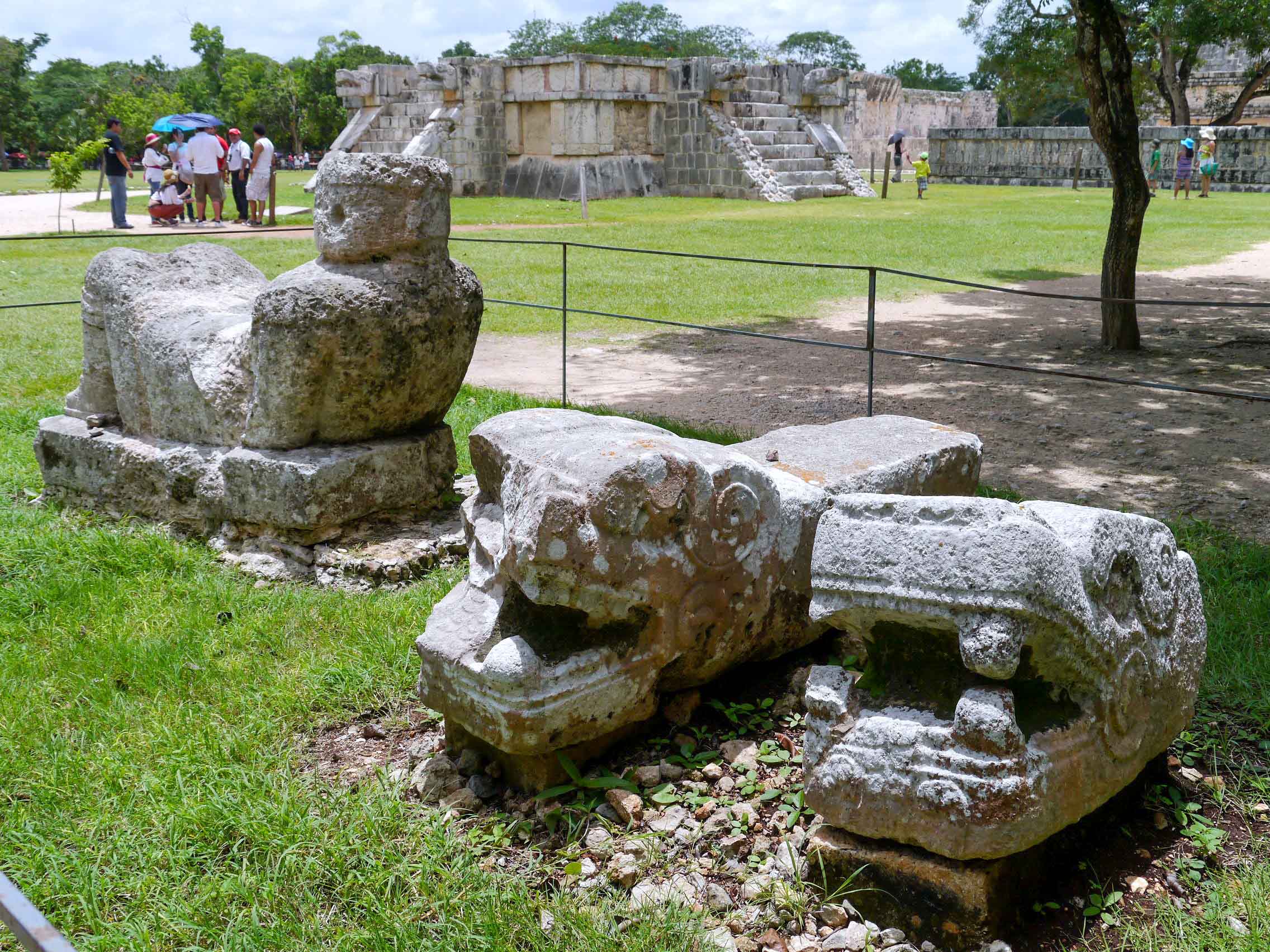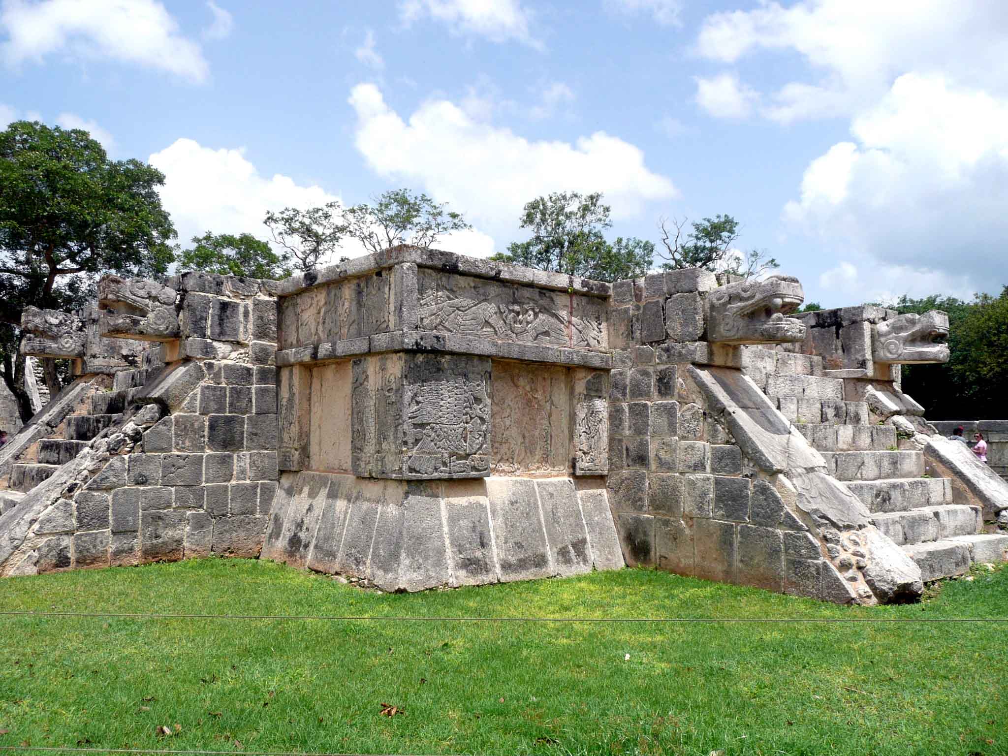 The Platforma de los Cráneos [Platform of Skulls] is a T-shaped platform embellished with carved skulls and eagles depicted tearing open the chests of men to consume their hearts. Archaeologists speculate that it was used to display the heads of human sacrifice. The carvings on the adjacent Platforma de las Águilas y Jaguares [Temple of the Eagles and Jaguars] present similarly gruesome scenes, showcasing eagles and jaguars devouring human hearts. A bit further lies the Platforma de Venus [Temple of Venus]. It is believed that the Maya utilized this platform for observing the planet Venus, managing to measure the 584-day Venus cycle with only a two-hour margin of error.