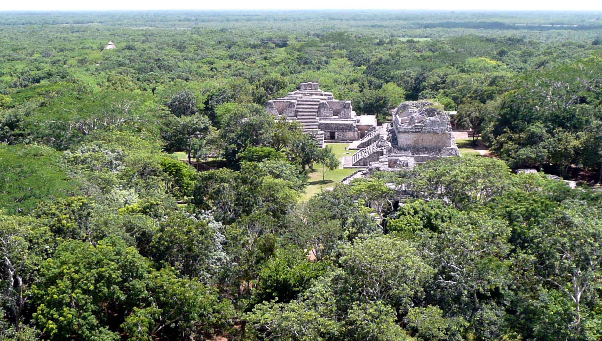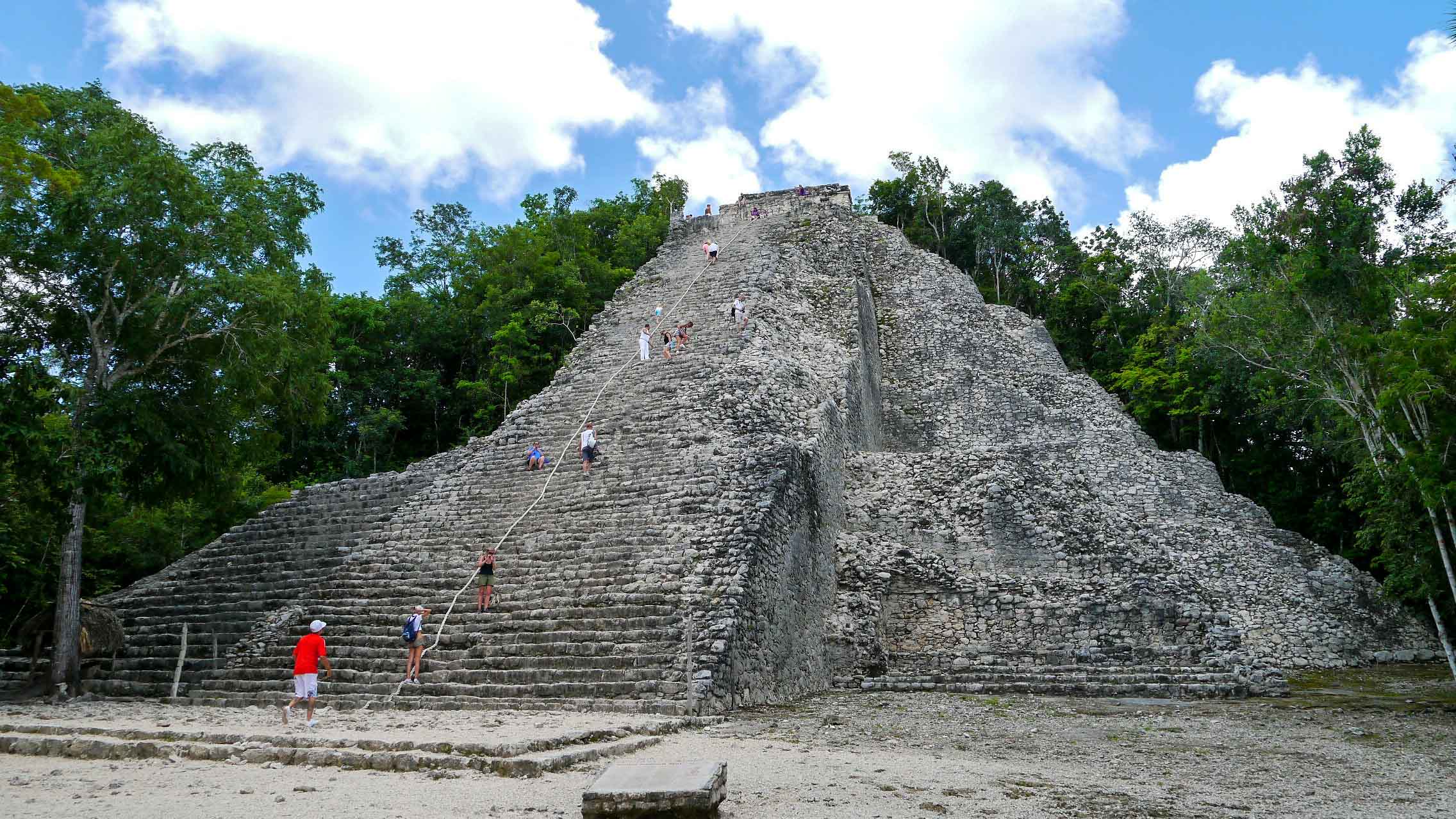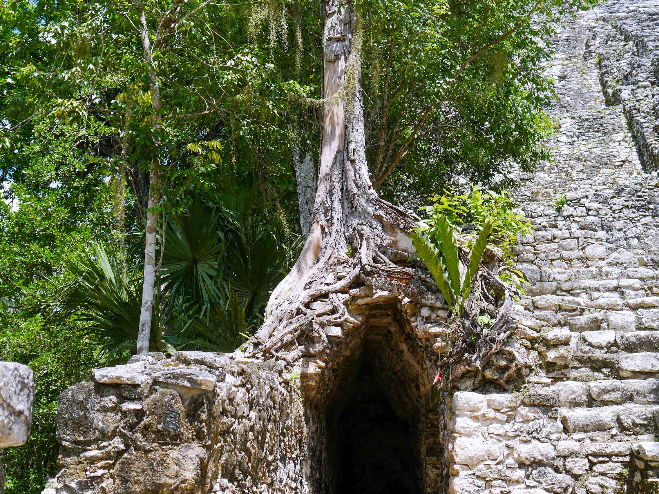 Located approximately 1.5 km to the north is the renowned Nohoch Mul [Big Mound], also known as the Great Pyramid, which is the most famous structure within the site. Standing at a height of 42 meters, it is the second tallest Maya structure on the Yucatán peninsula. Although the climb to reach the temple at the top is challenging due to the steep ascent and the deteriorated condition of the stones, the breathtaking panoramic view of the seemingly endless expanse of flat, shrubby jungle makes the effort worthwhile. Adorning the doorway of the temple is a carving of the Descending God. In front of Structure 10, stands the site’s best-preserved stela, portraying a ruler adorned in lavish attire, gripping a large scepter, and exerting authority over two kneeling captives, while two more captives stand at his feet.