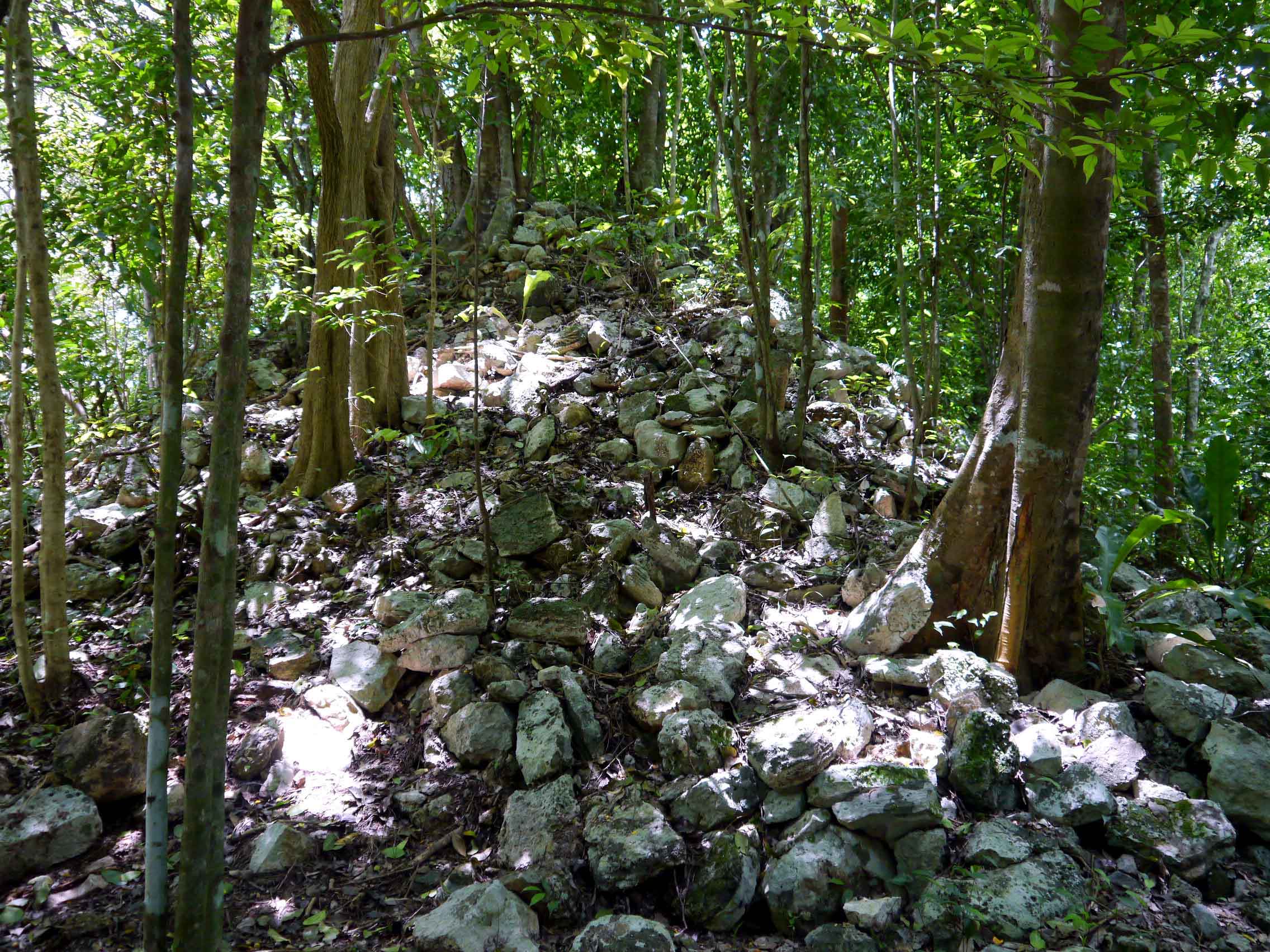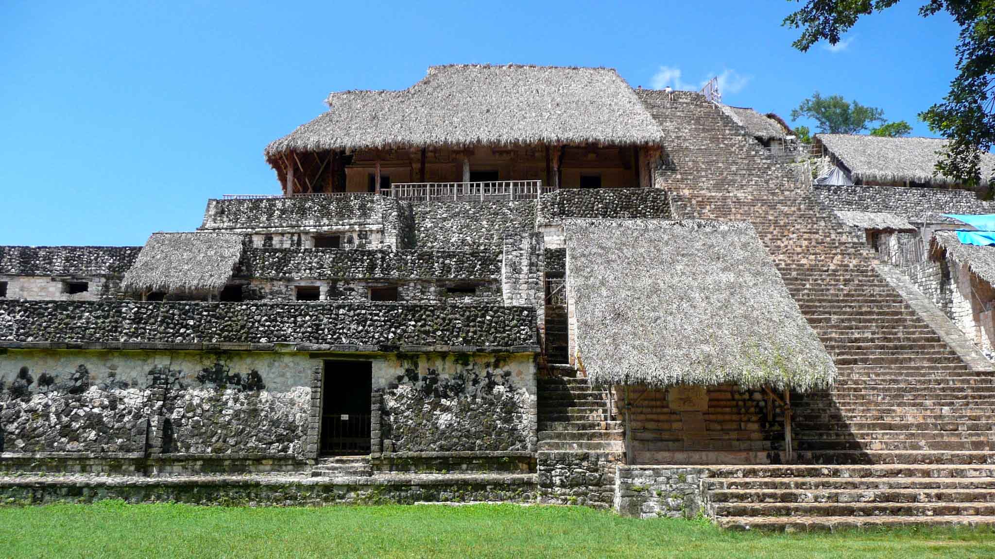 Group D comprises various structures, including the Conjunto Pinturas [Paintings Group] and the Xaibé [Crossroads]. The pyramidal Templo de los Frescos [Temple of the Frescoes] features traces of glyphs and frescoes on its lintel, as well as remnants of vividly colored murals inside. Situated at the intersection of four sacbeob, the structure known as Xaibé stands out with its unconventional design for Maya architecture – a four-tiered conical structure adorned with two medial moldings. While its rounded shape has led to speculation that it served as an observatory, there is no concrete evidence to support this hypothesis