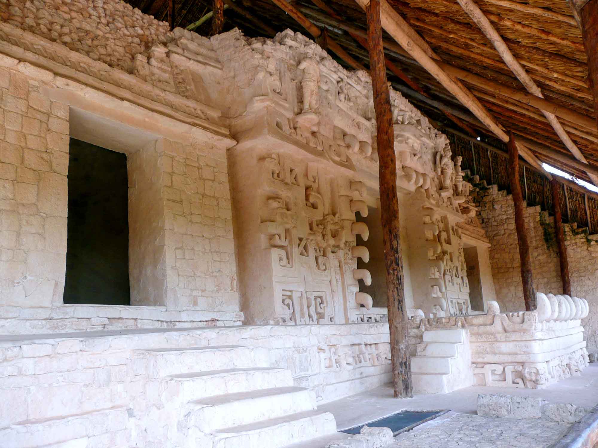 The Edificio de las Monjas [Nunnery], is a substantial structure believed by archaeologists to have functioned as a palace for Maya royalty. Its multitude of small rooms drew comparisons to European convent cells, which led the conquistadors to give it the name. Adjacent to the east is a smaller building known as La Iglesia [The Church], which is adorned with intricately carved masks that cover nearly its entire surface.