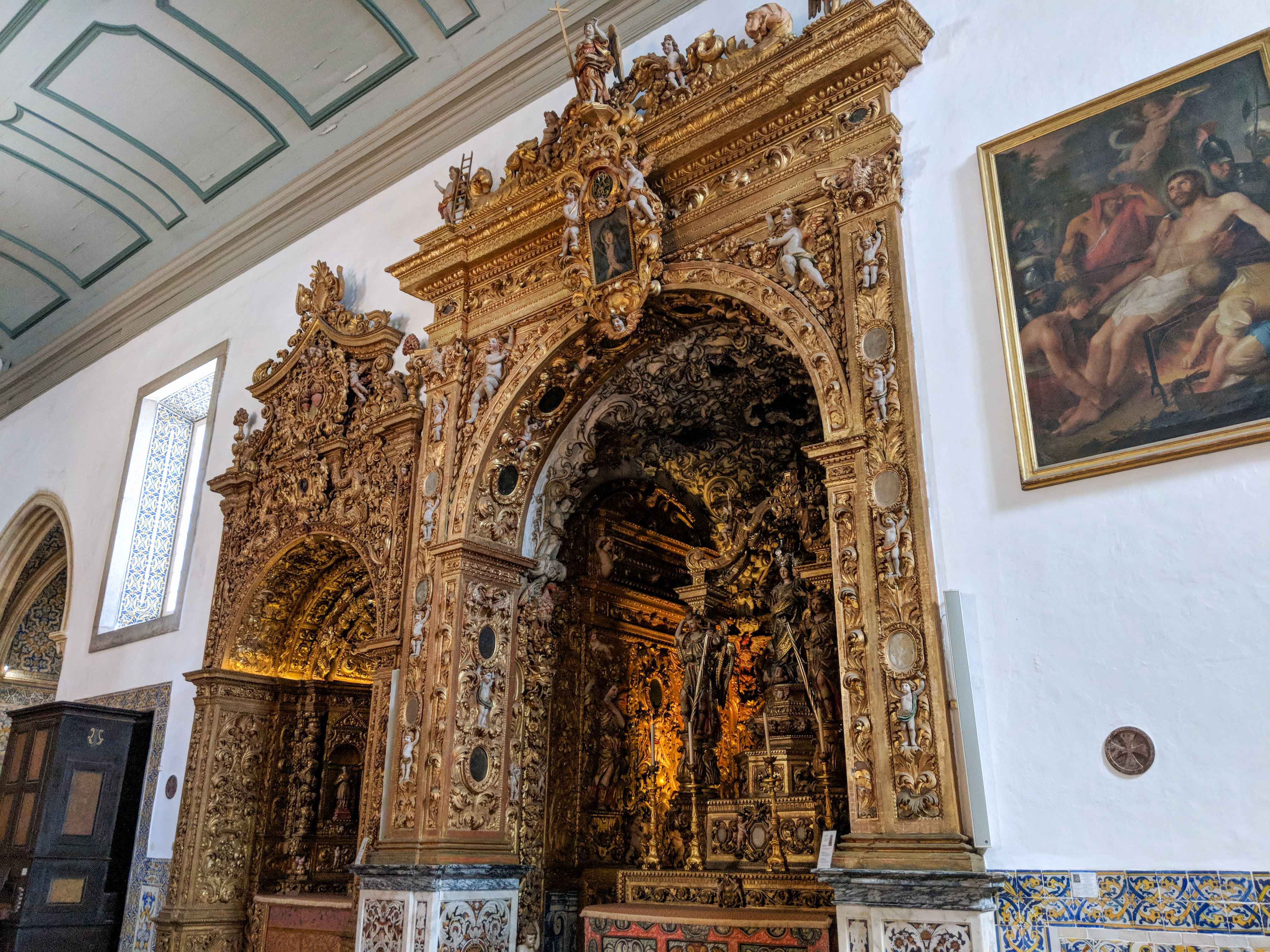 The finest churches in town include the Igreja de Santo António [Church of St Antony], Igreja de Santa Maria [Church of Santa Maria], and Igreja de São Sebastião [Church of St Sebastian]. Igreja de Santo António is known for its collection of eight panel paintings depicting the miracles attributed to St Antony. The church is richly decorated with gilded woodcarvings and blue and white azulejos. In Igreja de Santa Maria, of local interest is a statue of São Gonçalo of Lagos, a fisherman’s son born in 1360, who became an Augustinian monk, preacher, and composer of religious music. The plain white-washed walls of Igreja de São Sebastião conceal an elegant baroque main altar adorned with beautiful statues and intricate stone carvings.