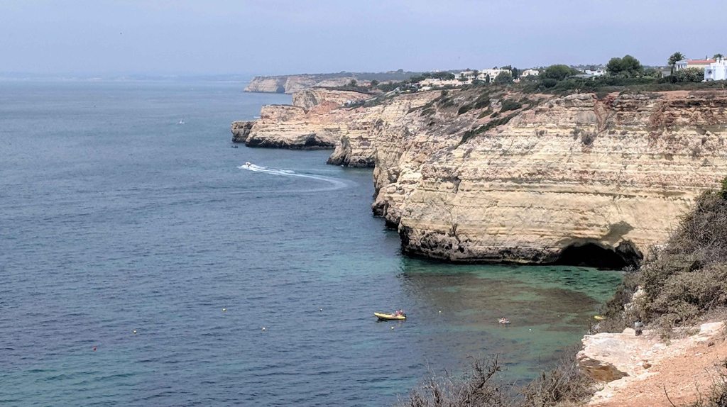 The Sete Vales Suspenso Hiking Trail stretches along the Algarve coastline, starting from Praia Vale do Centianes [Centianes Valley Beach] in the west and ending at Praia da Marinha [Navy Beach]. It can be walked in either direction. At Praia de Benagil [Benagil Beach], visitors have the option to embark on a boat tour and experience a different perspective of the area.