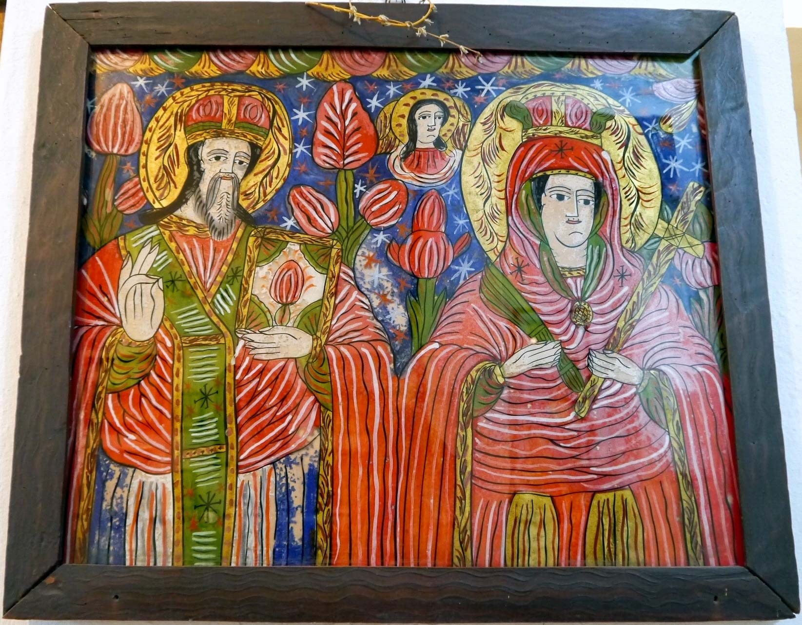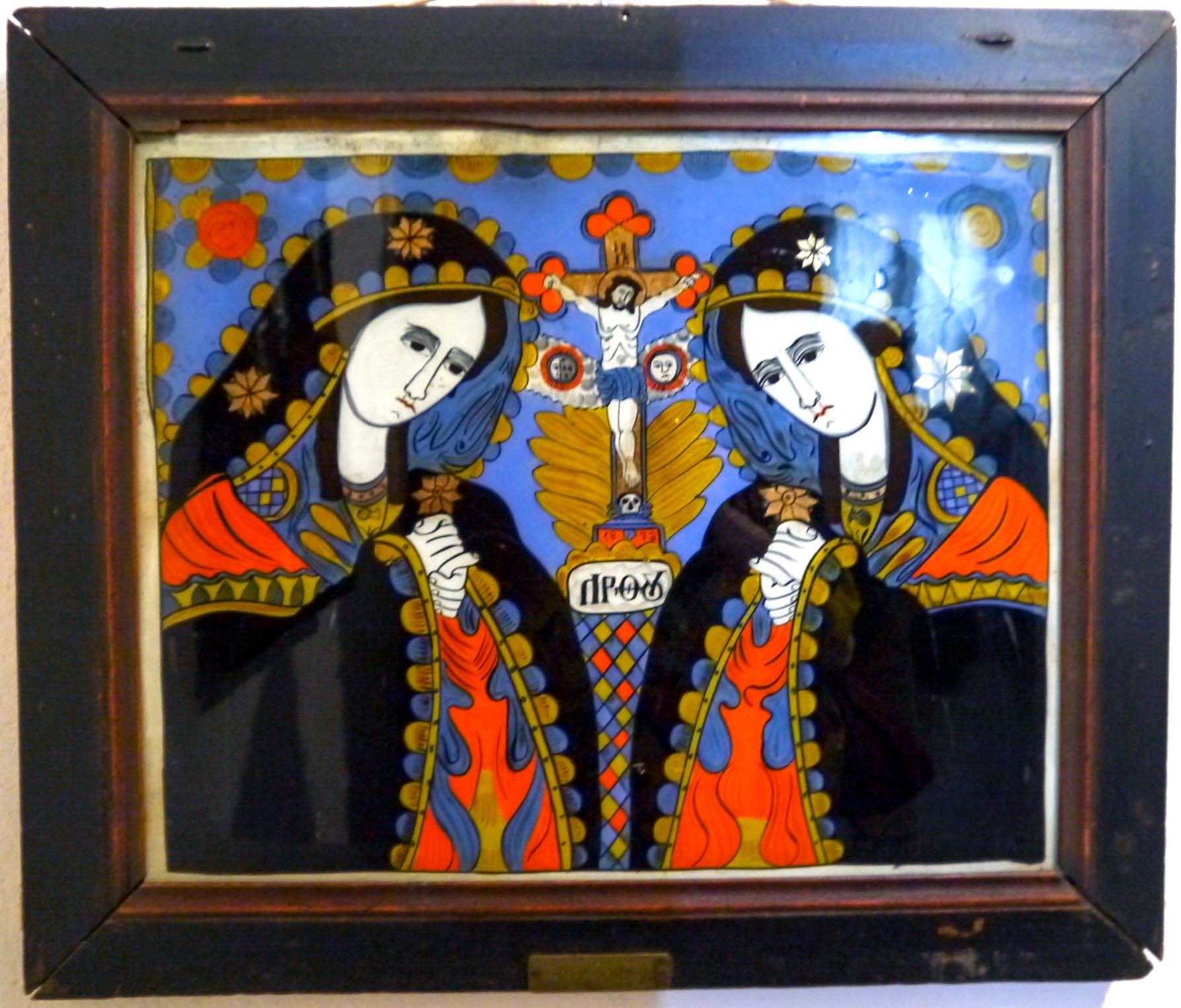 Unlike traditional icons, which are painted on wood, these religious images were created using a 300-year-old method of painting on glass. In fact, the icons themselves were painted as an inverted image on the backside of the glass, a technique known as revers glass painting. Along with the use of paint, gold or silver foils were employed for decorative purposes. Once completed, the paintings were coated with varnish to protect them from moisture and then framed. These small, locally made icons on glass were considerably more affordable compared to the imported icons painted on wood.
