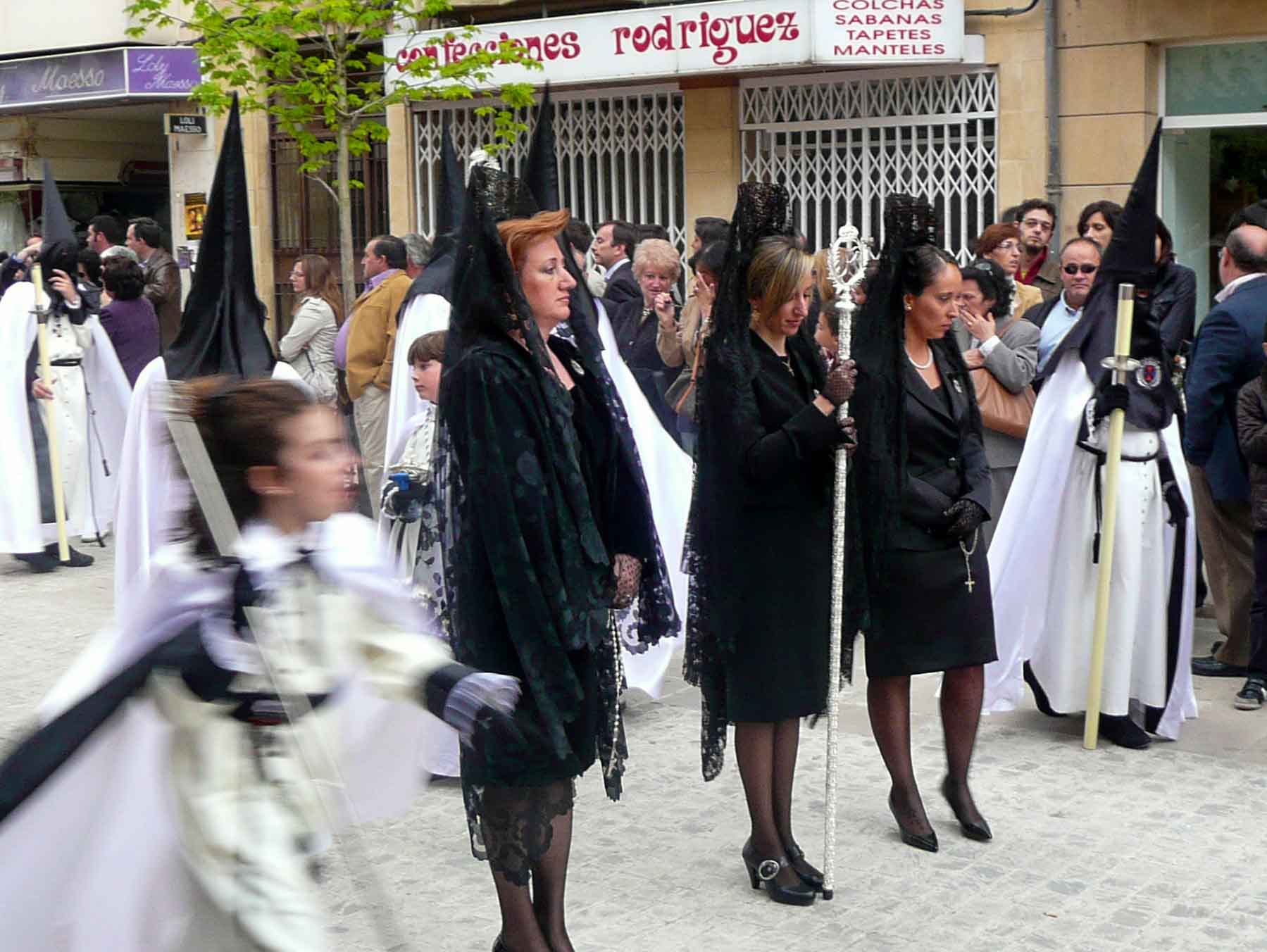 The nazarenos can also carry candles, torches, or wooden crosses, and in some cases, they may walk barefoot or wear shackles and chains as acts of penance. Some participants wear stylized historical uniforms in line with the parade’s theme, while women often dress in black and wear mantillas [black lace veil], as a sign of mourning for the death of Jesus Christ. Typically, the processions are accompanied by marching bands or groups playing solemn music on drums and trumpets. Occasionally, a singer from a balcony along the route joins in and performs a saeta dedicated to the float. Saetas are traditional religious songs renowned for evoking mournful emotions.