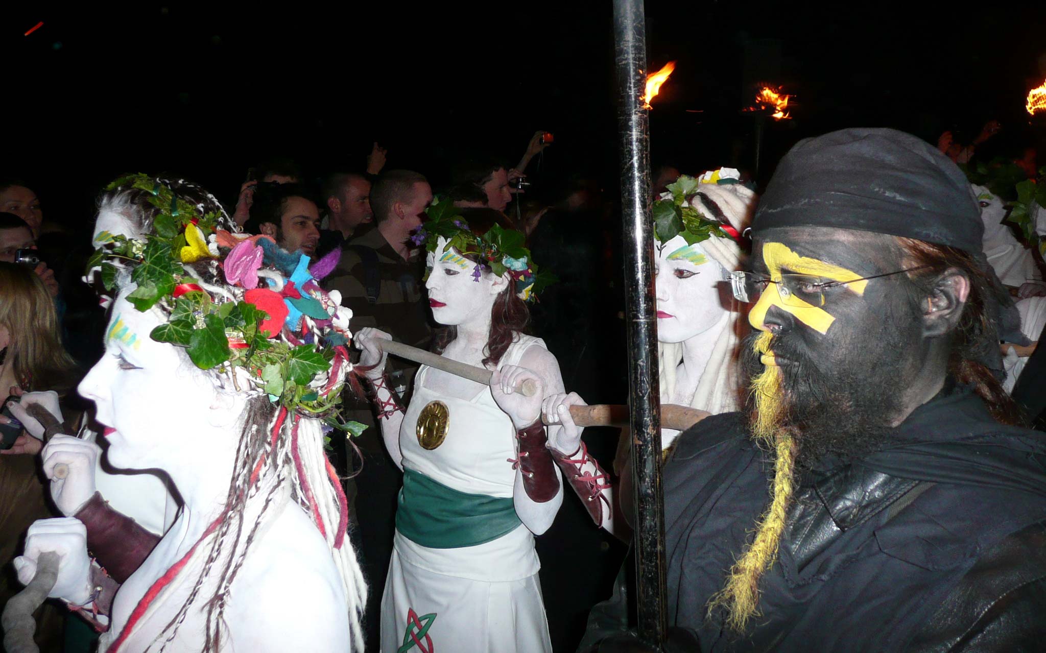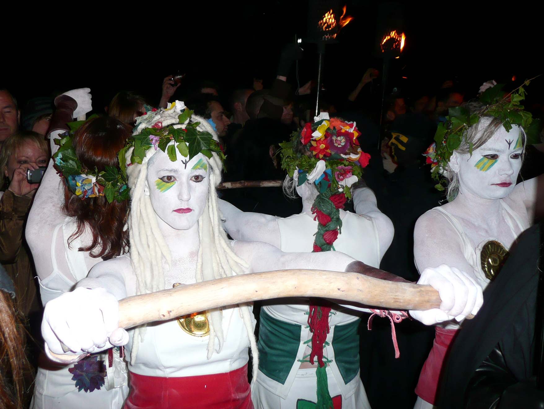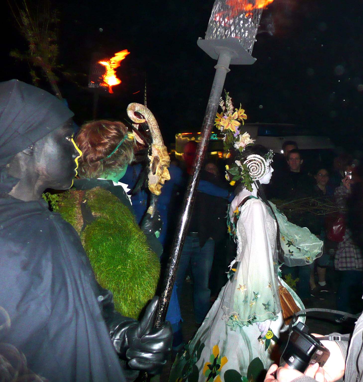 The procession is led by the May Queen, symbolizing purity, strength, and the potential for growth. She embodies the energy of the earth and encompasses all aspects of existence. Accompanying her is the Green Man, dressed in ivy, leaves, and flowers, representing the vibrant spirit of spring vegetation and embodying the essence of fertility. Initially, at the start of the procession the Green Man takes on the form of the Horned God. Following closely behind are the White Women, led by the Queen’s four Handmaidens (North, South, East, and West). Serving as guardians and caretakers of the May Queen, the White Women symbolize order and discipline. The procession is also accompanied by drummers and torchbearers. Through their journey, they encounter various groups that either aid or hinder their progress towards the Green Man’s fate and the May Queen’s destiny. Notably, the Red Men and the Red Beastie Drummers attempt to disrupt the procession with their wild and lascivious behavior. Their energy stems from rebirth, introducing chaos and disorder.
