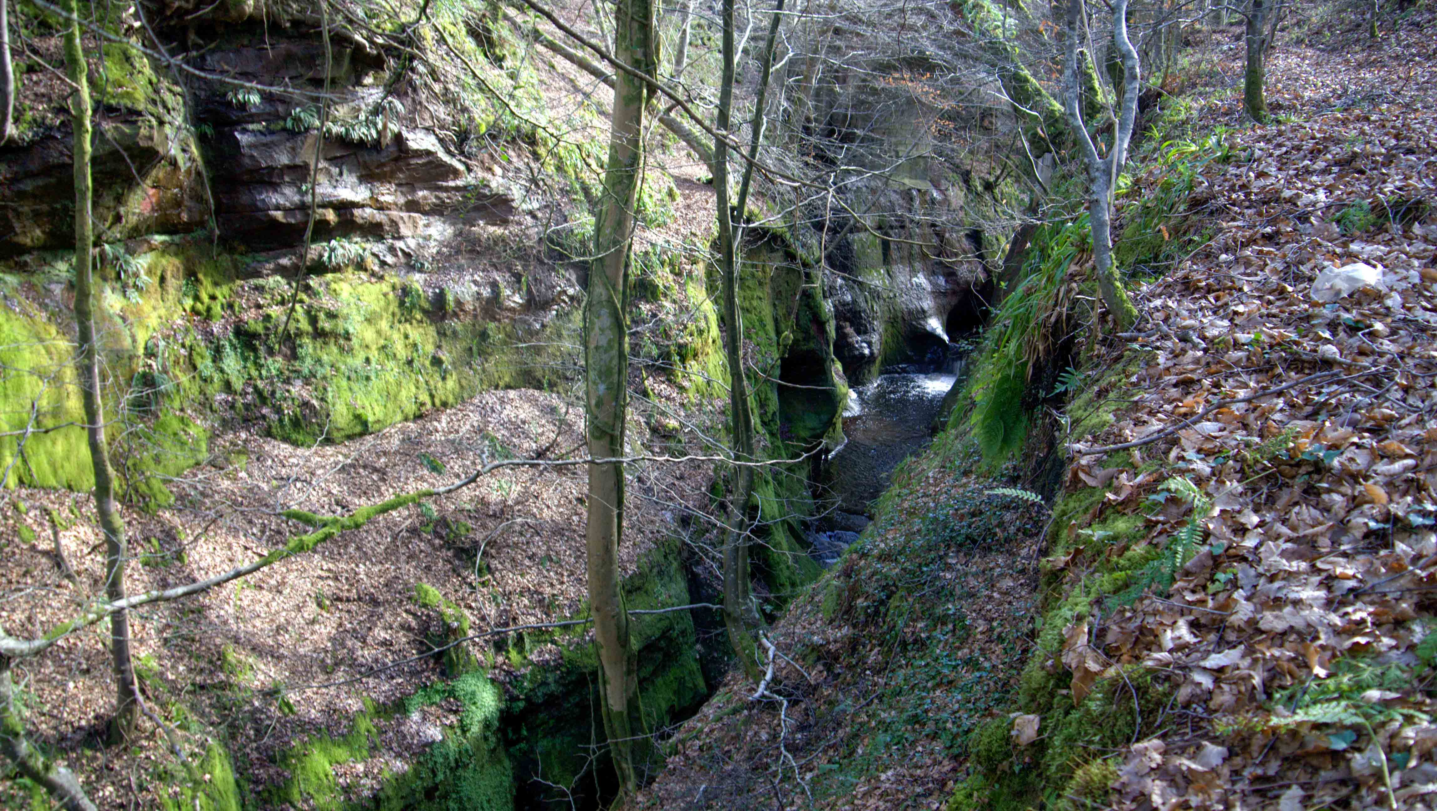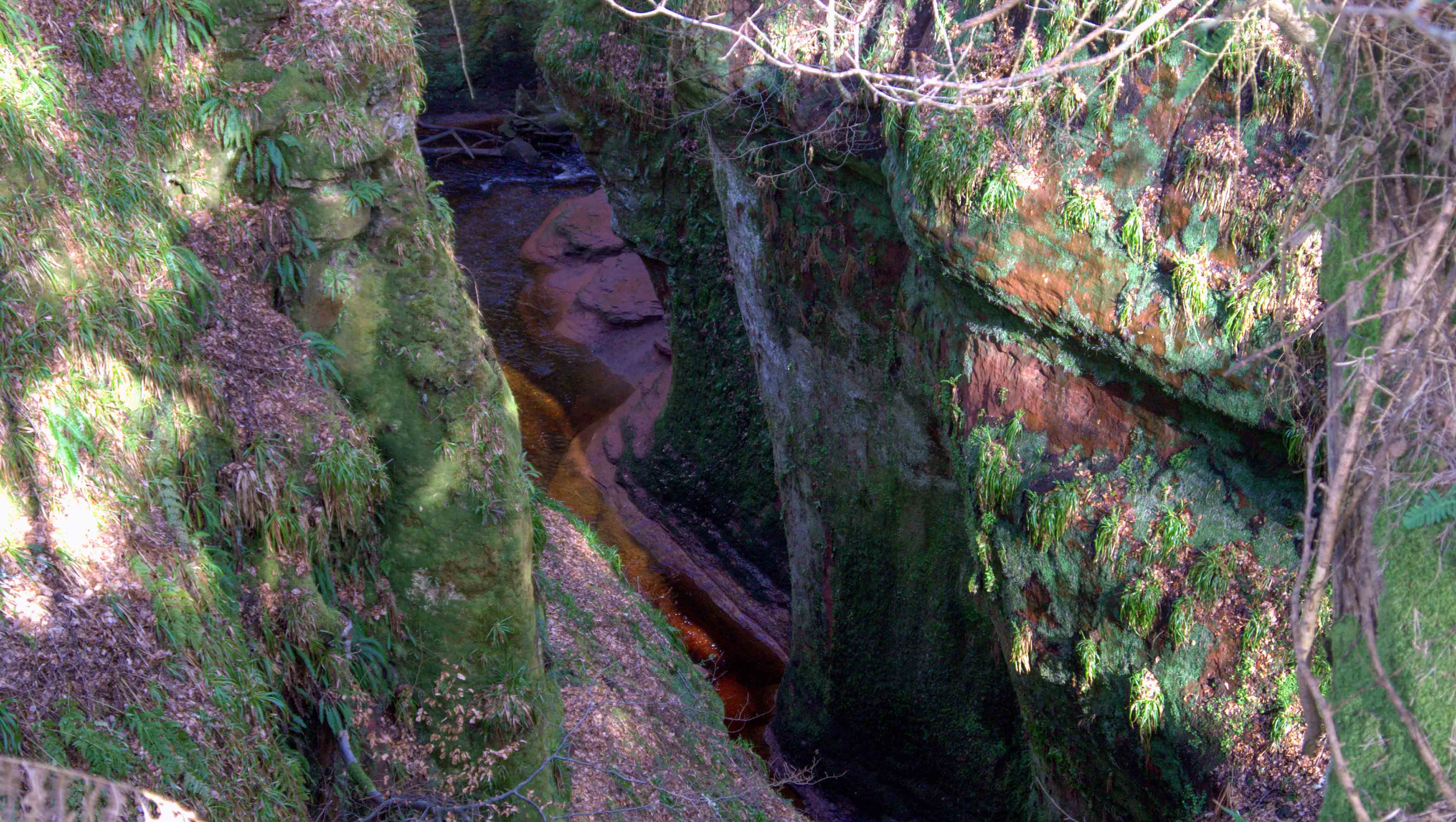 The trail maintains a safe distance from the edge of the gorge. At the end of the walk, there is a steep and treacherous staircase, built around 1860, that descends to the bottom of the gorge. Within the depths, amidst the moss-covered stones, lies a circular rock known as the Devil’s Pulpit. To fully explore the length of the gorge, visitors must venture into the ice-cold waters of the stream.