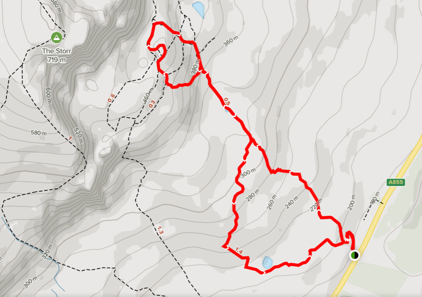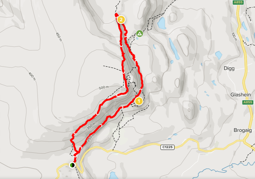 The path is without a defined trail, consisting of stretches of turf for long distances with some sections being very boggy. The return journey is made via a minor road.