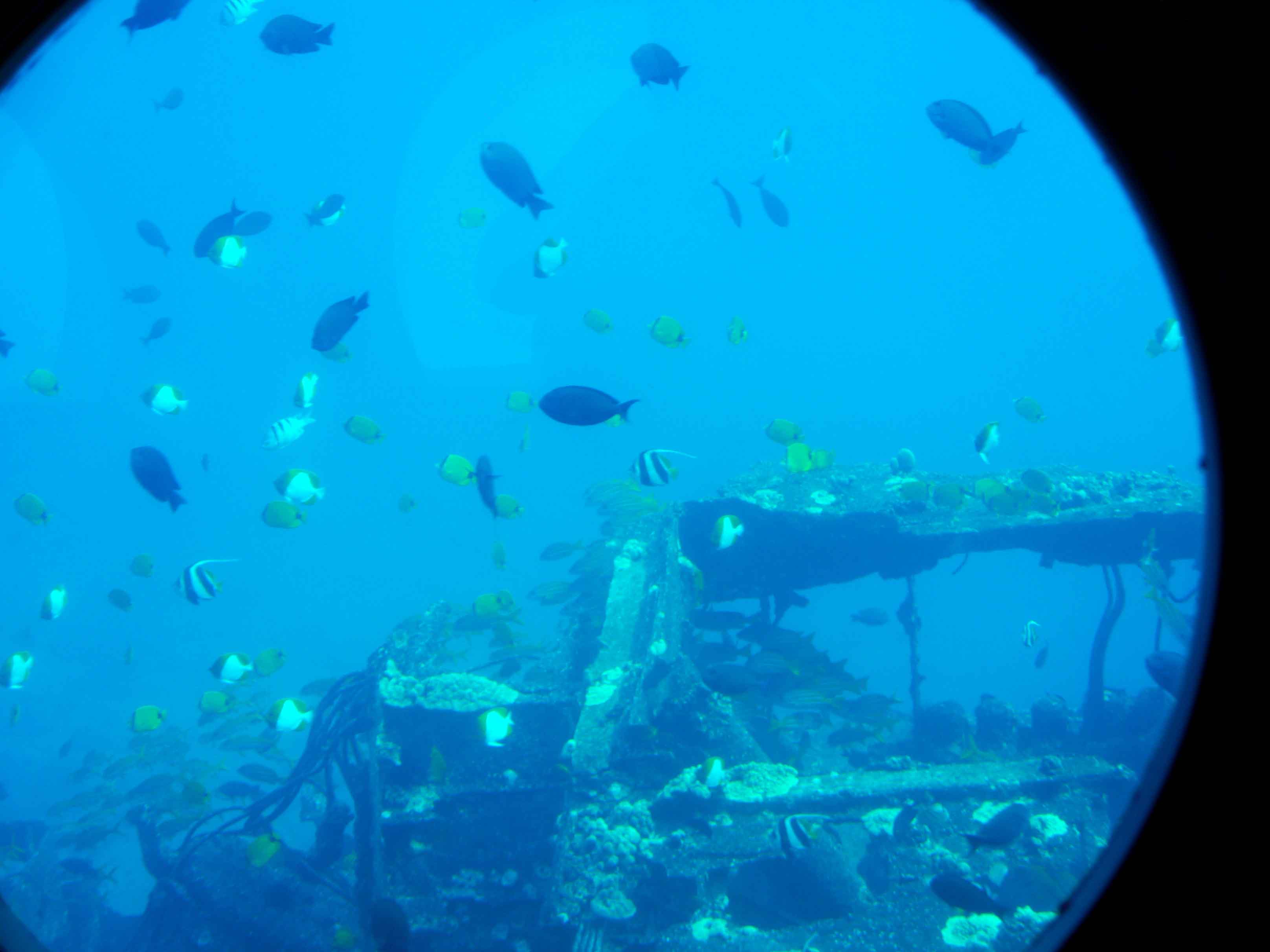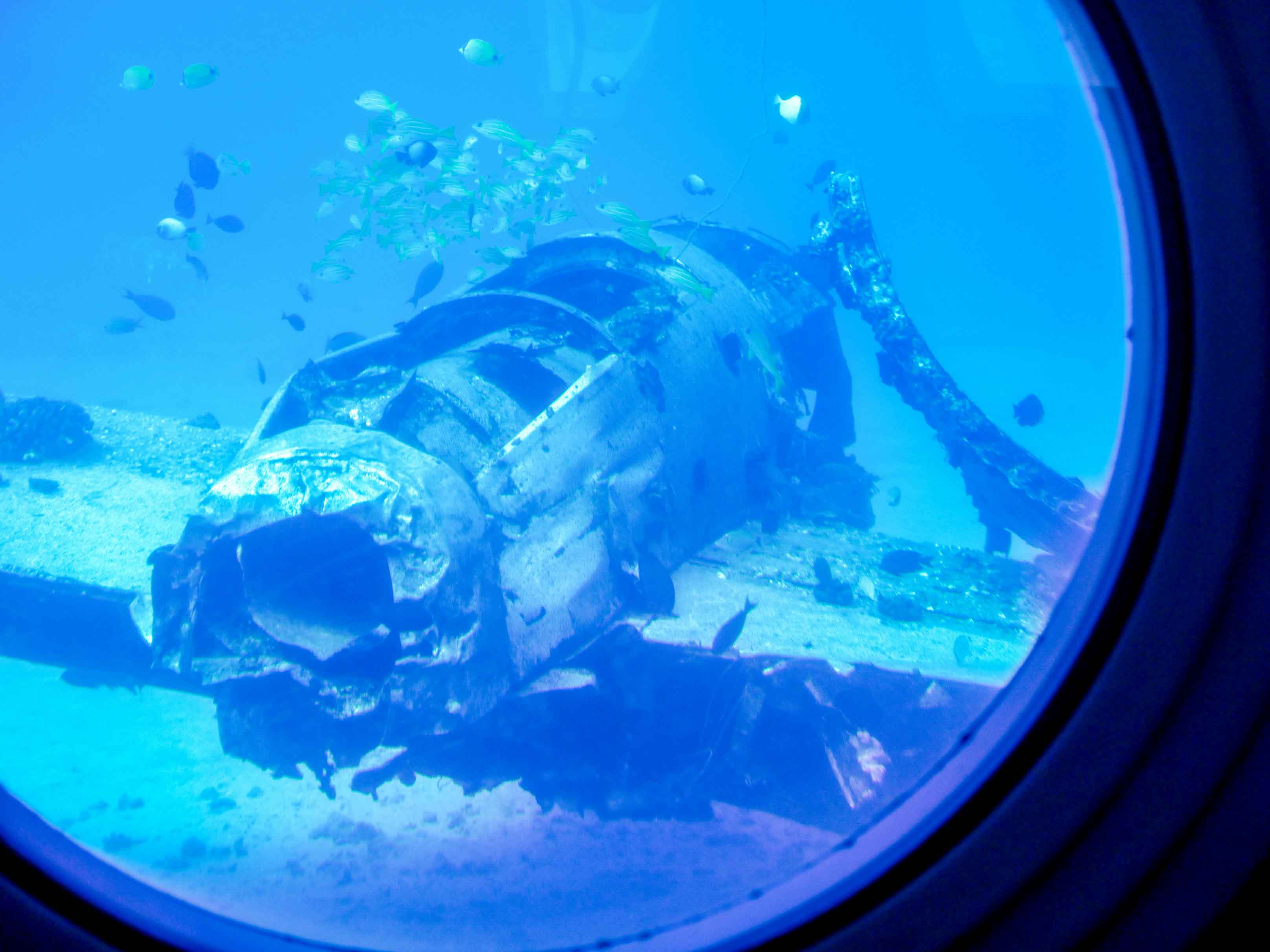 As the submarine glides gently, a kaleidoscope of marine life comes into view. Vibrant coral reefs sprawl across artificial structures, their intricate formations providing shelter to an array of sea creatures. Schools of Hawaiian tropical fish gracefully dart through the water, their colors shimmering like gems in the sunlight. Some become so accustomed to the sight of the submarine that they venture up close to peer through the view port. Majestic sharks lurk under cover or glide effortlessly by, their sleek forms a testament to the raw power of the ocean. Amidst this bustling activity, gentle green sea turtles gracefully navigate their underwater domain, their ancient presence a reminder of nature’s enduring beauty. Yet, the wonders of this underwater world extend beyond its inhabitants. Throughout the tour, the submarine navigates past remnants of human history now embraced by the sea. Artificial reefs teem with life, providing sanctuary to countless species seeking refuge. Sunken ships stand as silent witnesses to bygone eras, their rusted hulls now adorned with intricate corals and swaying seaweed. Scattered across the ocean floor lie the haunting remains of airplanes, swept away by the fury of hurricanes and now transformed into eerie yet captivating underwater landscapes.